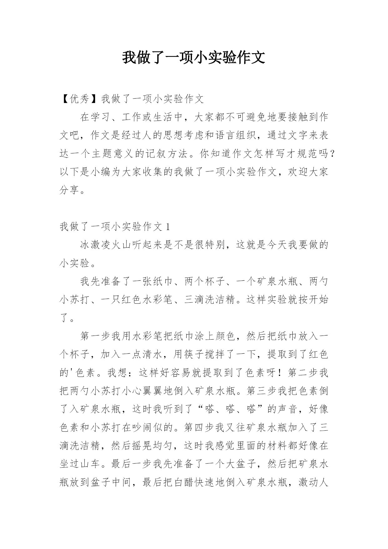 我做了一项小实验作文【优秀】我做了一项小实验作文在学习、工作或生活中,大家都不可避免地要接触到作文吧,作文是经过人的思想考虑和语言组织,通过文字来表达一个主题意义的记叙方法。你知道作文怎样写才规范吗?以下是小编为大家收集的我做了一项小实验作文,欢迎大家分享。我做了一项小实验作文1冰激凌火山听起来是不是很特别,这就是今天我要做的小实验。我先准备了一张纸巾、两个杯子、一个矿泉水瓶、两勺小苏打、一只红色水彩笔、三滴洗洁精。这样实验就按开始了。第一步我用水彩笔把纸巾涂上颜色,然后把纸巾放入一个杯子,加入一点清水,
