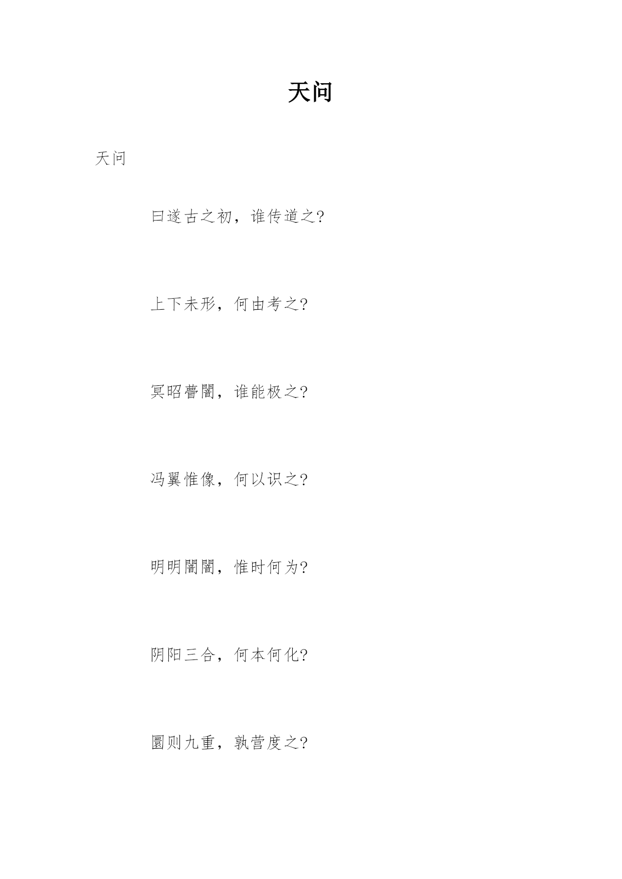 天问天问曰遂古之初,谁传道之?上下未形,何由考之?冥昭瞢闇,谁能极之?冯翼惟像,何以识之?明明闇闇,惟时何为?阴阳三合,何本何化?圜则九重,孰营度之?惟兹何功,孰初作之?斡维焉系,天极焉加?八柱何当,东南何亏?九天之际,安放安属?隅隈多有,谁知其数?天何所沓?十二焉分?日月安属?列星安陈?出自汤谷,次于蒙氾。自明及晦,所行几里?夜光何德,死则又育?厥利维何,而顾菟在腹?女歧无合,夫焉取九子?伯强何处?惠气安在?何阖而晦?何开而明?角宿未旦,曜灵安藏?不任汩鸿,师何以尚之?佥曰“何忧&rdquo