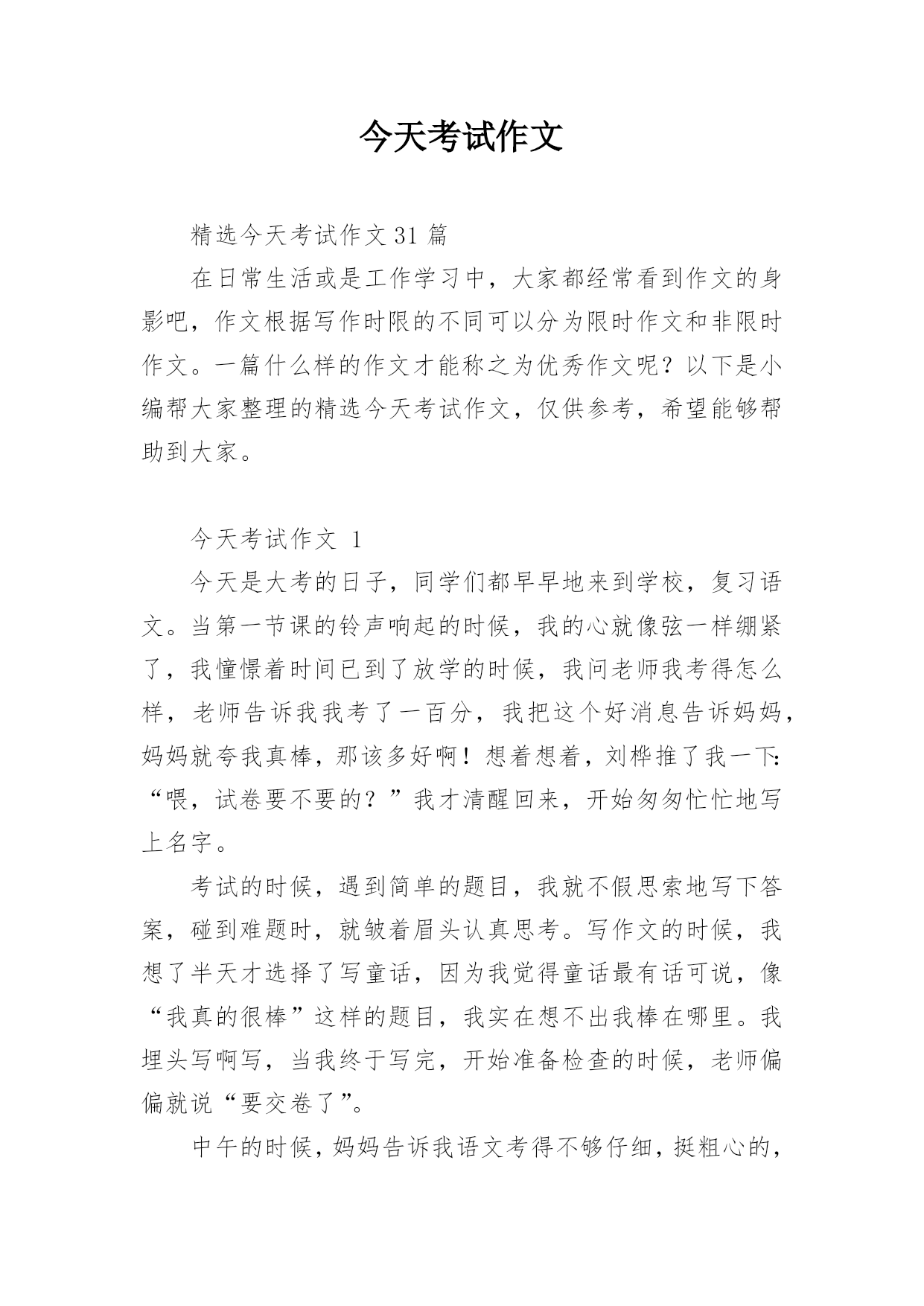 今天考试作文精选今天考试作文31篇在日常生活或是工作学习中,大家都经常看到作文的身影吧,作文根据写作时限的不同可以分为限时作文和非限时作文。一篇什么样的作文才能称之为优秀作文呢?以下是小编帮大家整理的精选今天考试作文,仅供参考,希望能够帮助到大家。今天考试作文1今天是大考的日子,同学们都早早地来到学校,复习语文。当第一节课的铃声响起的时候,我的心就像弦一样绷紧了,我憧憬着时间已到了放学的时候,我问老师我考得怎么样,老师告诉我我考了一百分,我把这个好消息告诉妈妈,妈妈就夸我真棒,那该多好啊!想着想着,刘桦推