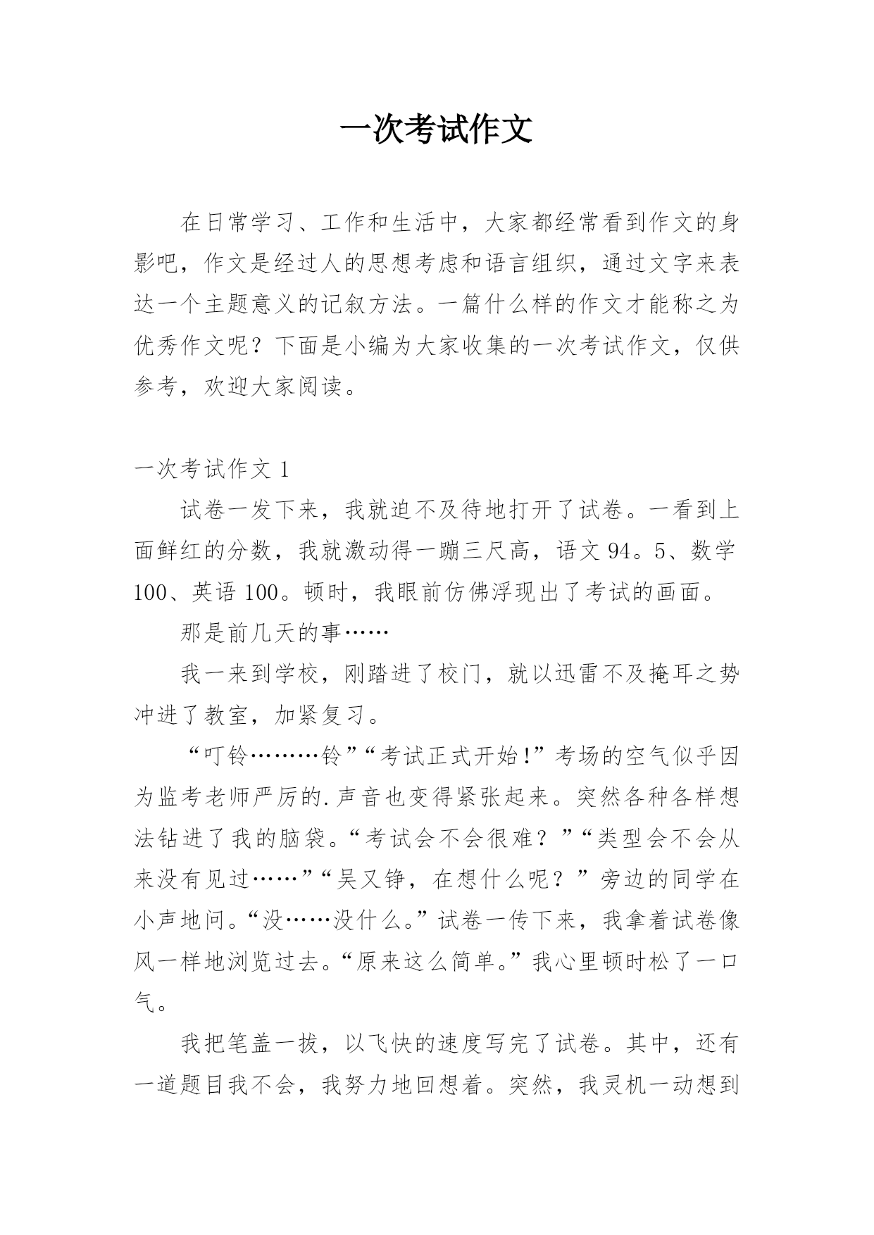 一次考试作文在日常学习、工作和生活中,大家都经常看到作文的身影吧,作文是经过人的思想考虑和语言组织,通过文字来表达一个主题意义的记叙方法。一篇什么样的作文才能称之为优秀作文呢?下面是小编为大家收集的一次考试作文,仅供参考,欢迎大家阅读。一次考试作文1试卷一发下来,我就迫不及待地打开了试卷。一看到上面鲜红的分数,我就激动得一蹦三尺高,语文94。5、数学100、英语100。顿时,我眼前仿佛浮现出了考试的画面。那是前几天的事……我一来到学校,刚踏进了校门,就以迅雷不及掩耳之势冲进了教室,加紧复习。“叮铃………铃