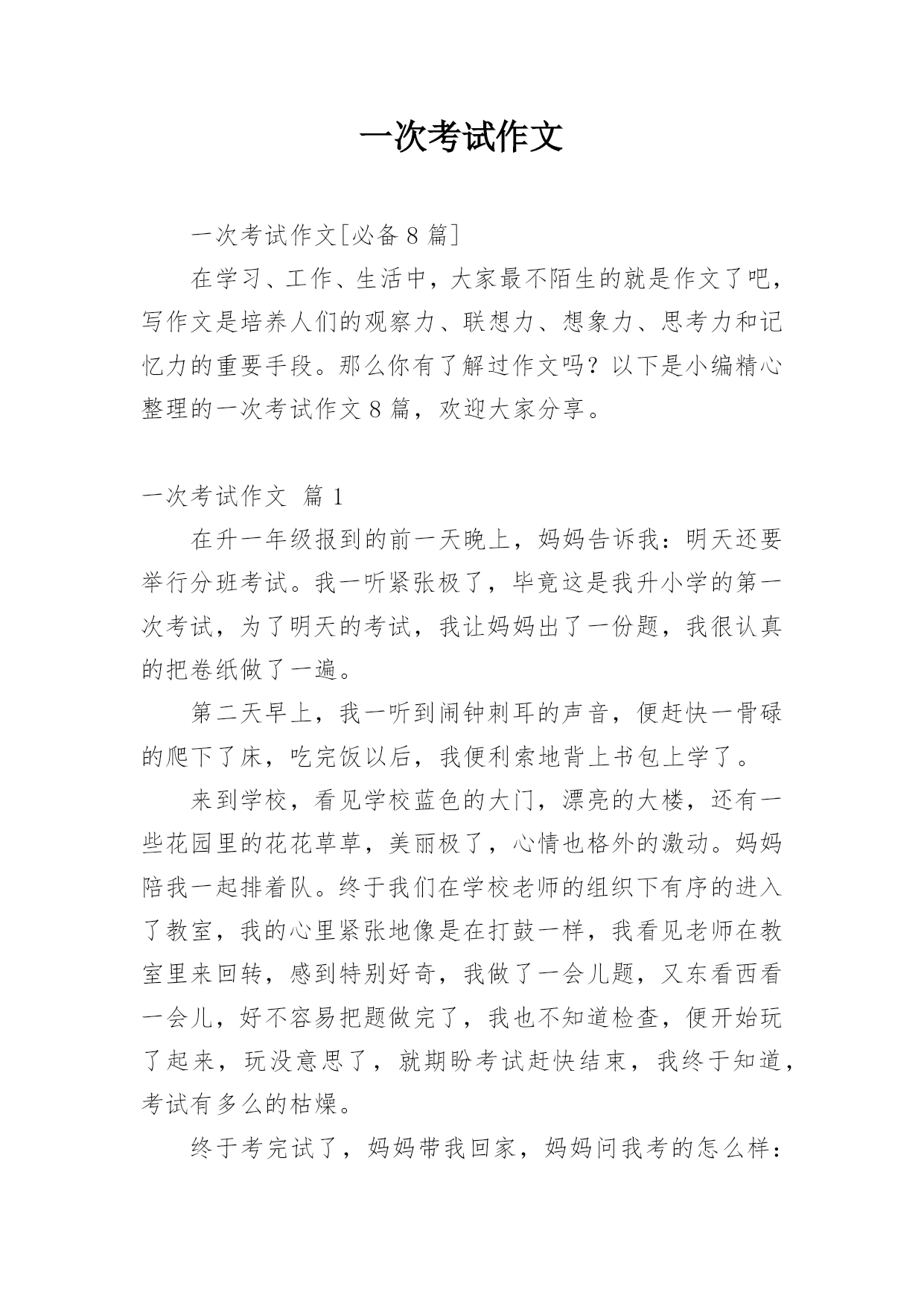 一次考试作文一次考试作文[必备8篇]在学习、工作、生活中,大家最不陌生的就是作文了吧,写作文是培养人们的观察力、联想力、想象力、思考力和记忆力的重要手段。那么你有了解过作文吗?以下是小编精心整理的一次考试作文8篇,欢迎大家分享。一次考试作文篇1在升一年级报到的前一天晚上,妈妈告诉我:明天还要举行分班考试。我一听紧张极了,毕竟这是我升小学的第一次考试,为了明天的考试,我让妈妈出了一份题,我很认真的把卷纸做了一遍。第二天早上,我一听到闹钟刺耳的声音,便赶快一骨碌的爬下了床,吃完饭以后,我便利索地背上书包上学了
