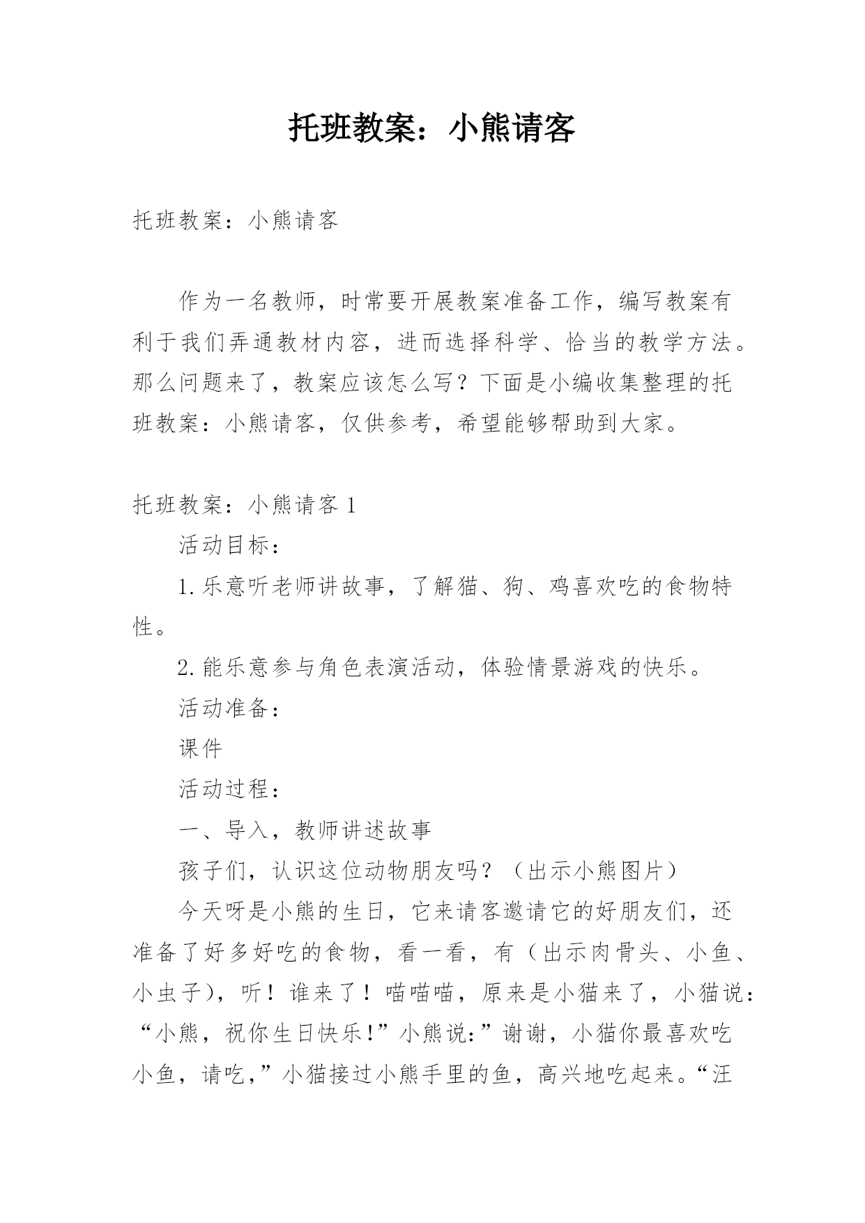 托班教案:小熊请客托班教案:小熊请客作为一名教师,时常要开展教案准备工作,编写教案有利于我们弄通教材内容,进而选择科学、恰当的教学方法。那么问题来了,教案应该怎么写?下面是小编收集整理的托班教案:小熊请客,仅供参考,希望能够帮助到大家。托班教案:小熊请客1活动目标:1.乐意听老师讲故事,了解猫、狗、鸡喜欢吃的食物特性。2.能乐意参与角色表演活动,体验情景游戏的快乐。活动准备:课件活动过程:一、导入,教师讲述故事孩子们,认识这位动物朋友吗?(出示小熊图片)今天呀是小熊的生日,它来请客邀请它的好朋友们,还准备