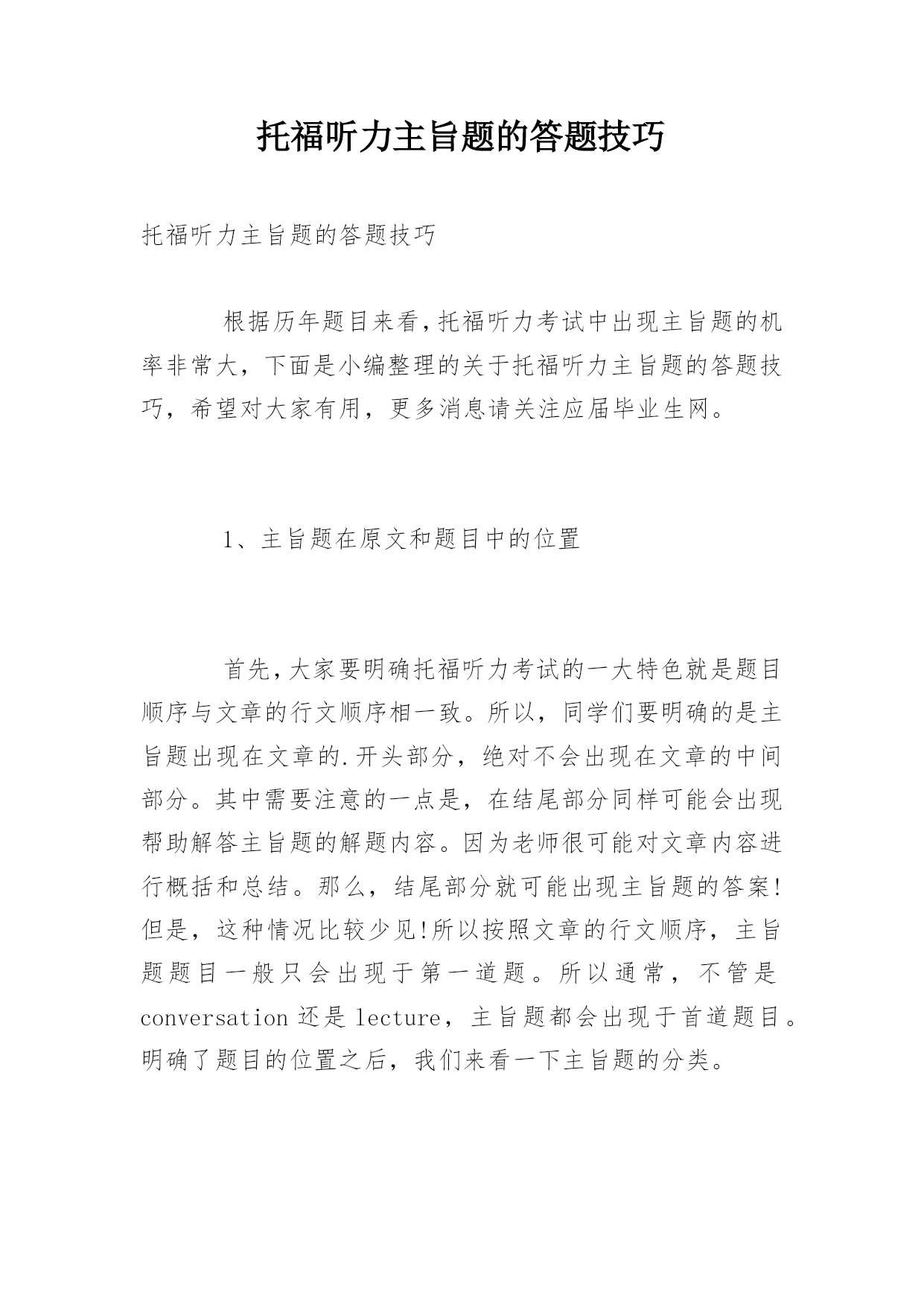 托福听力主旨题的答题技巧托福听力主旨题的答题技巧根据历年题目来看,托福听力考试中出现主旨题的机率非常大,下面是小编整理的关于托福听力主旨题的答题技巧,希望对大家有用,更多消息请关注应届毕业生网。1、主旨题在原文和题目中的位置首先,大家要明确托福听力考试的一大特色就是题目顺序与文章的行文顺序相一致。所以,同学们要明确的是主旨题出现在文章的.开头部分,绝对不会出现在文章的中间部分。其中需要注意的一点是,在结尾部分同样可能会出现帮助解答主旨题的解题内容。因为老师很可能对文章内容进行概括和总结。那么,结尾部分就可
