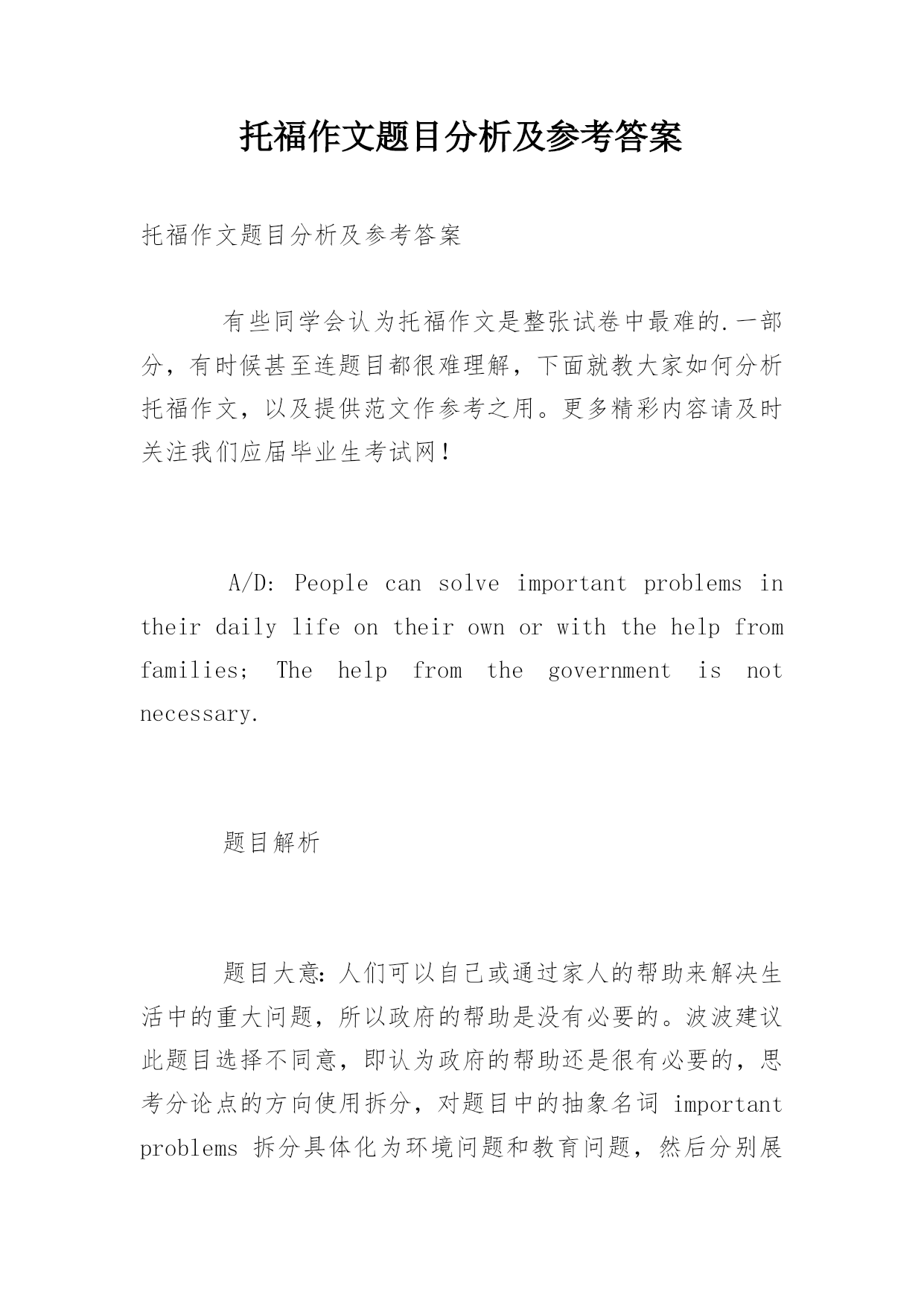 托福作文题目分析及参考答案托福作文题目分析及参考答案有些同学会认为托福作文是整张试卷中最难的.一部分,有时候甚至连题目都很难理解,下面就教大家如何分析托福作文,以及提供范文作参考之用。更多精彩内容请及时关注我们应届毕业生考试网!A/D:Peoplecansolveimportantproblemsintheirdailylifeontheirownorwiththehelpfromfamilies;Thehelpfromthegovernmentisnotnecessary.题目解析题目大意:人们可以自己