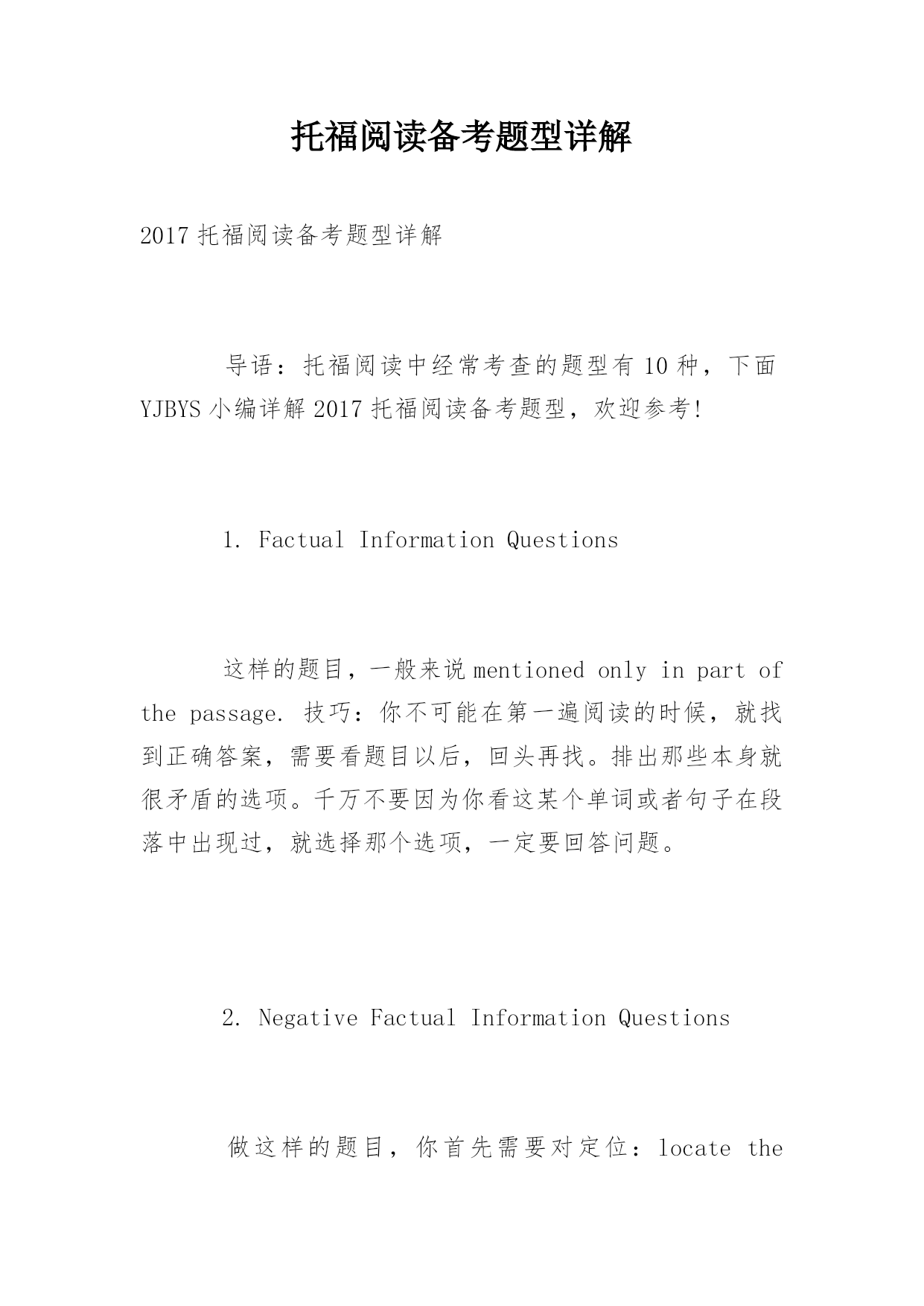 托福阅读备考题型详解2017托福阅读备考题型详解导语:托福阅读中经常考查的题型有10种,下面YJBYS小编详解2017托福阅读备考题型,欢迎参考!1.FactualInformationQuestions这样的题目,一般来说mentionedonlyinpartofthepassage.技巧:你不可能在第一遍阅读的时候,就找到正确答案,需要看题目以后,回头再找。排出那些本身就很矛盾的选项。千万不要因为你看这某个单词或者句子在段落中出现过,就选择那个选项,一定要回答问题。2.NegativeFactualI