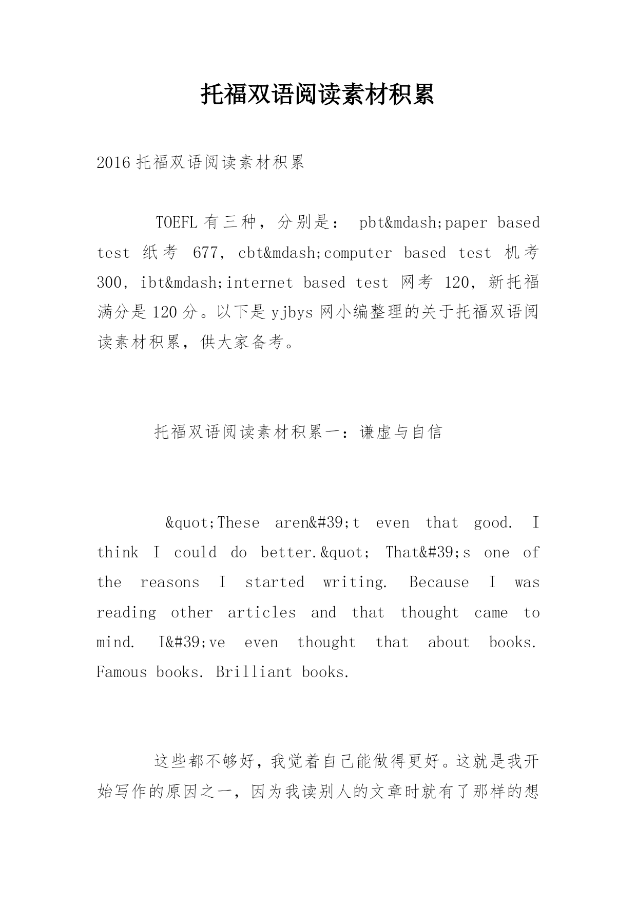 托福双语阅读素材积累2016托福双语阅读素材积累TOEFL有三种,分别是:pbt—paperbasedtest纸考677,cbt—computerbasedtest机考300,ibt—internetbasedtest网考120,新托福满分是120分。以下是yjbys网小编整理的关于托福双语阅读素材积累,供大家备考。托福双语阅读素材积累一:谦虚与自信"Thesearen'teventhatgood.IthinkIcoulddobetter."