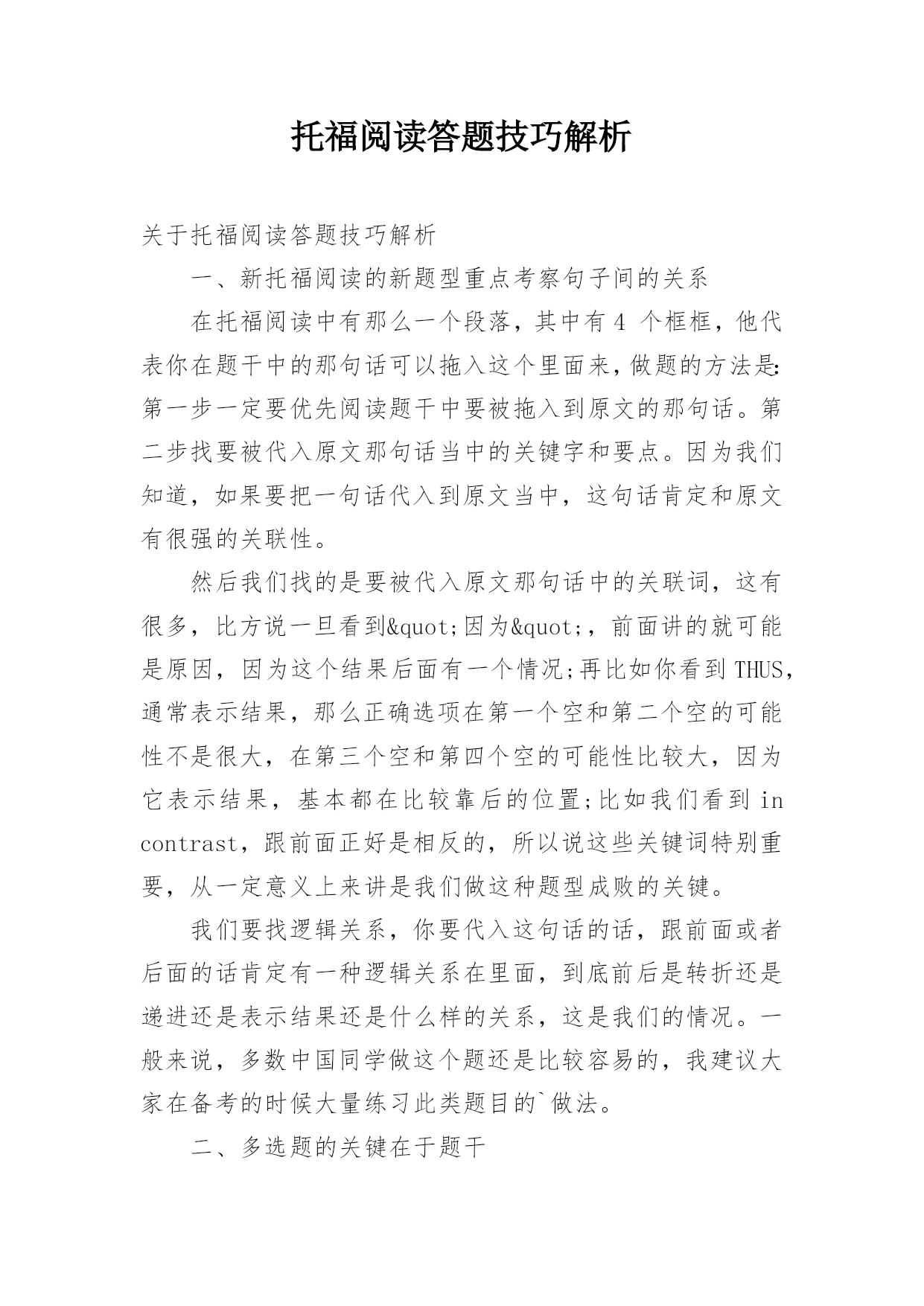托福阅读答题技巧解析关于托福阅读答题技巧解析一、新托福阅读的新题型重点考察句子间的关系在托福阅读中有那么一个段落,其中有4个框框,他代表你在题干中的那句话可以拖入这个里面来,做题的方法是:第一步一定要优先阅读题干中要被拖入到原文的那句话。第二步找要被代入原文那句话当中的关键字和要点。因为我们知道,如果要把一句话代入到原文当中,这句话肯定和原文有很强的关联性。然后我们找的是要被代入原文那句话中的关联词,这有很多,比方说一旦看到"因为",前面讲的就可能是原因,因为这个结果后面有一个情况;再