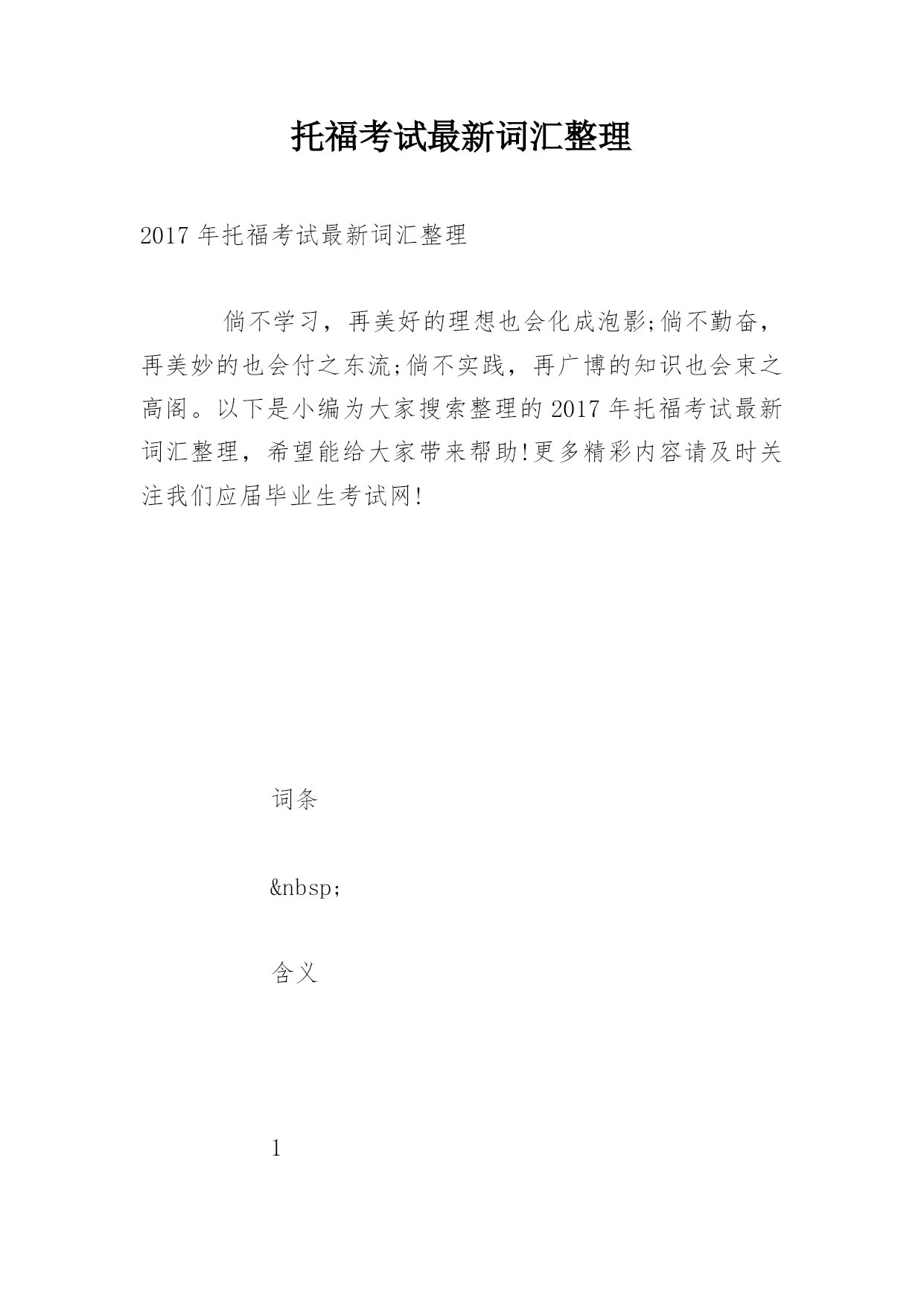 托福考试最新词汇整理2017年托福考试最新词汇整理倘不学习,再美好的理想也会化成泡影;倘不勤奋,再美妙的也会付之东流;倘不实践,再广博的知识也会束之高阁。以下是小编为大家搜索整理的2017年托福考试最新词汇整理,希望能给大家带来帮助!更多精彩内容请及时关注我们应届毕业生考试网!词条 含义1abandonvt.抛弃;放弃1 n.放纵;沉溺2abandonedadj.被抛弃的,废置的3abandonmentn.抛弃;放弃4abbreviatevt.缩短;缩写5abbreviationn.缩