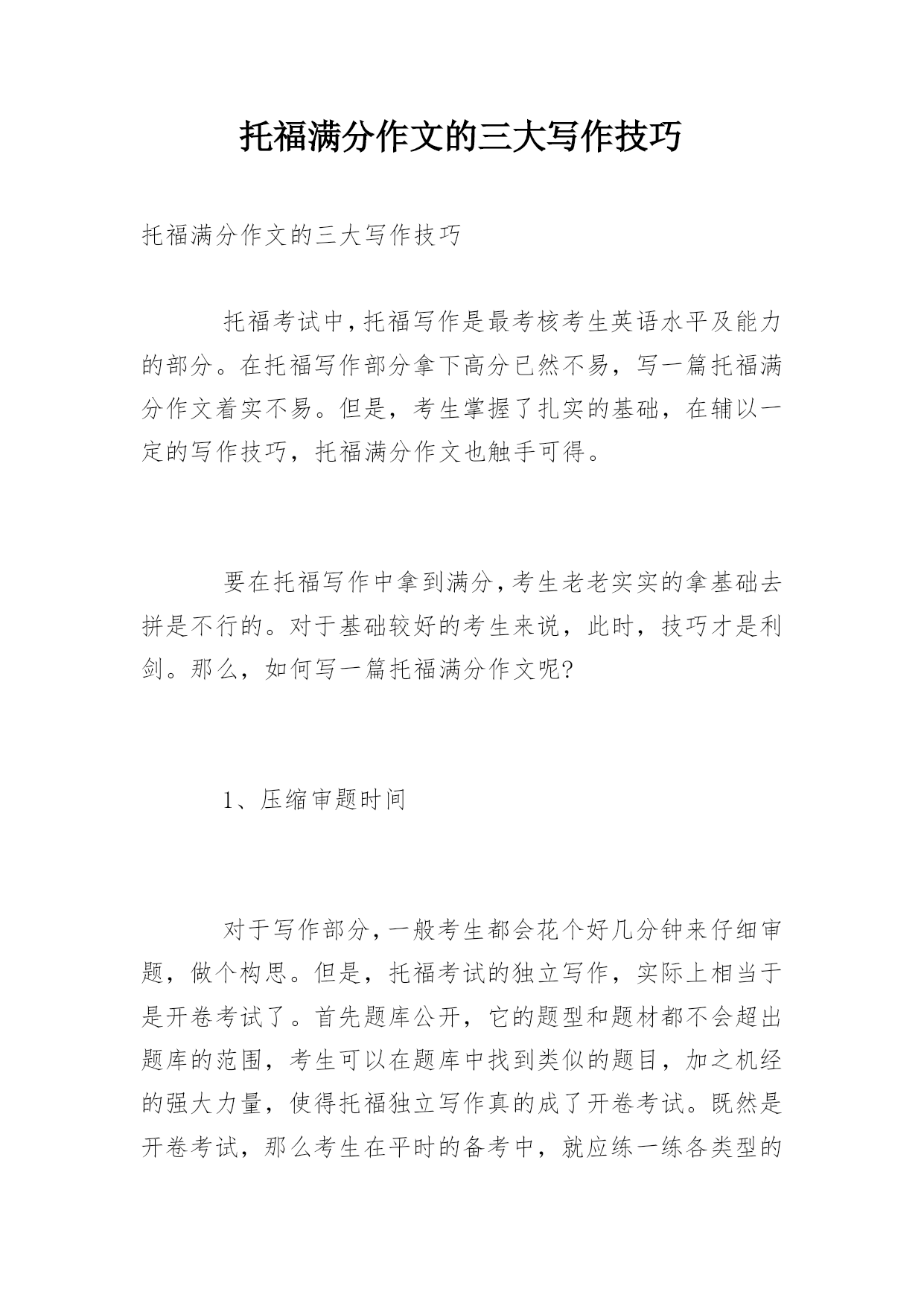 托福满分作文的三大写作技巧托福满分作文的三大写作技巧托福考试中,托福写作是最考核考生英语水平及能力的部分。在托福写作部分拿下高分已然不易,写一篇托福满分作文着实不易。但是,考生掌握了扎实的基础,在辅以一定的写作技巧,托福满分作文也触手可得。要在托福写作中拿到满分,考生老老实实的拿基础去拼是不行的。对于基础较好的考生来说,此时,技巧才是利剑。那么,如何写一篇托福满分作文呢?1、压缩审题时间对于写作部分,一般考生都会花个好几分钟来仔细审题,做个构思。但是,托福考试的独立写作,实际上相当于是开卷考试了。首先题库
