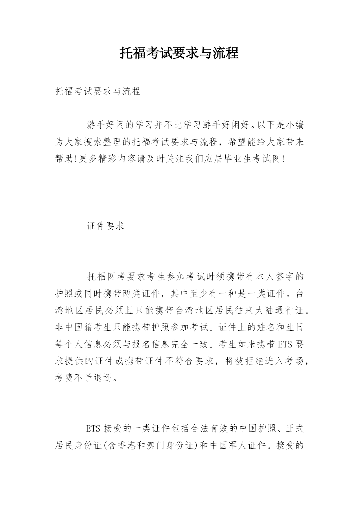 托福考试要求与流程托福考试要求与流程游手好闲的学习并不比学习游手好闲好。以下是小编为大家搜索整理的托福考试要求与流程,希望能给大家带来帮助!更多精彩内容请及时关注我们应届毕业生考试网!证件要求托福网考要求考生参加考试时须携带有本人签字的护照或同时携带两类证件,其中至少有一种是一类证件。台湾地区居民必须且只能携带台湾地区居民往来大陆通行证。非中国籍考生只能携带护照参加考试。证件上的姓名和生日等个人信息必须与报名信息完全一致。考生如未携带ETS要求提供的证件或携带证件不符合要求,将被拒绝进入考场,考费不予退还