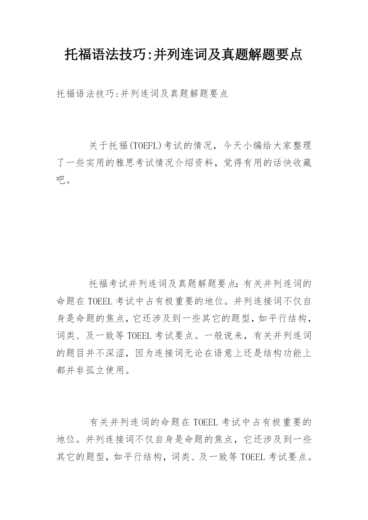 托福语法技巧:并列连词及真题解题要点托福语法技巧:并列连词及真题解题要点关于托福(TOEFL)考试的情况,今天小编给大家整理了一些实用的雅思考试情况介绍资料,觉得有用的话快收藏吧。托福考试并列连词及真题解题要点:有关并列连词的命题在TOEEL考试中占有极重要的地位。并列连接词不仅自身是命题的焦点,它还涉及到一些其它的题型,如平行结构,词类、及一致等TOEEL考试要点。一般说来,有关并列连词的题目并不深涩,因为连接词无论在语意上还是结构功能上都并非孤立使用。有关并列连词的命题在TOEEL考试中占有极重要的地