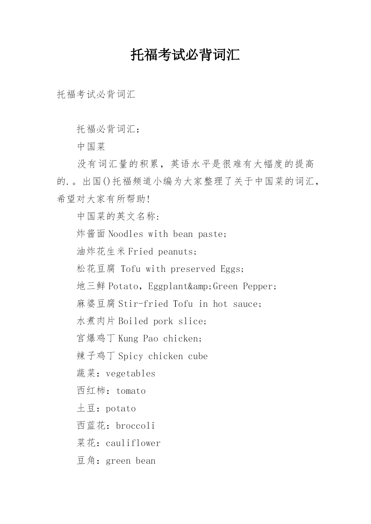 托福考试必背词汇托福考试必背词汇托福必背词汇:中国菜没有词汇量的积累,英语水平是很难有大幅度的提高的.。出国()托福频道小编为大家整理了关于中国菜的词汇,希望对大家有所帮助!中国菜的英文名称:炸酱面Noodleswithbeanpaste;油炸花生米Friedpeanuts;松花豆腐TofuwithpreservedEggs;地三鲜Potato,Eggplant&GreenPepper;麻婆豆腐Stir-friedTofuinhotsauce;水煮肉片Boiledporkslice;宫爆鸡丁Kun