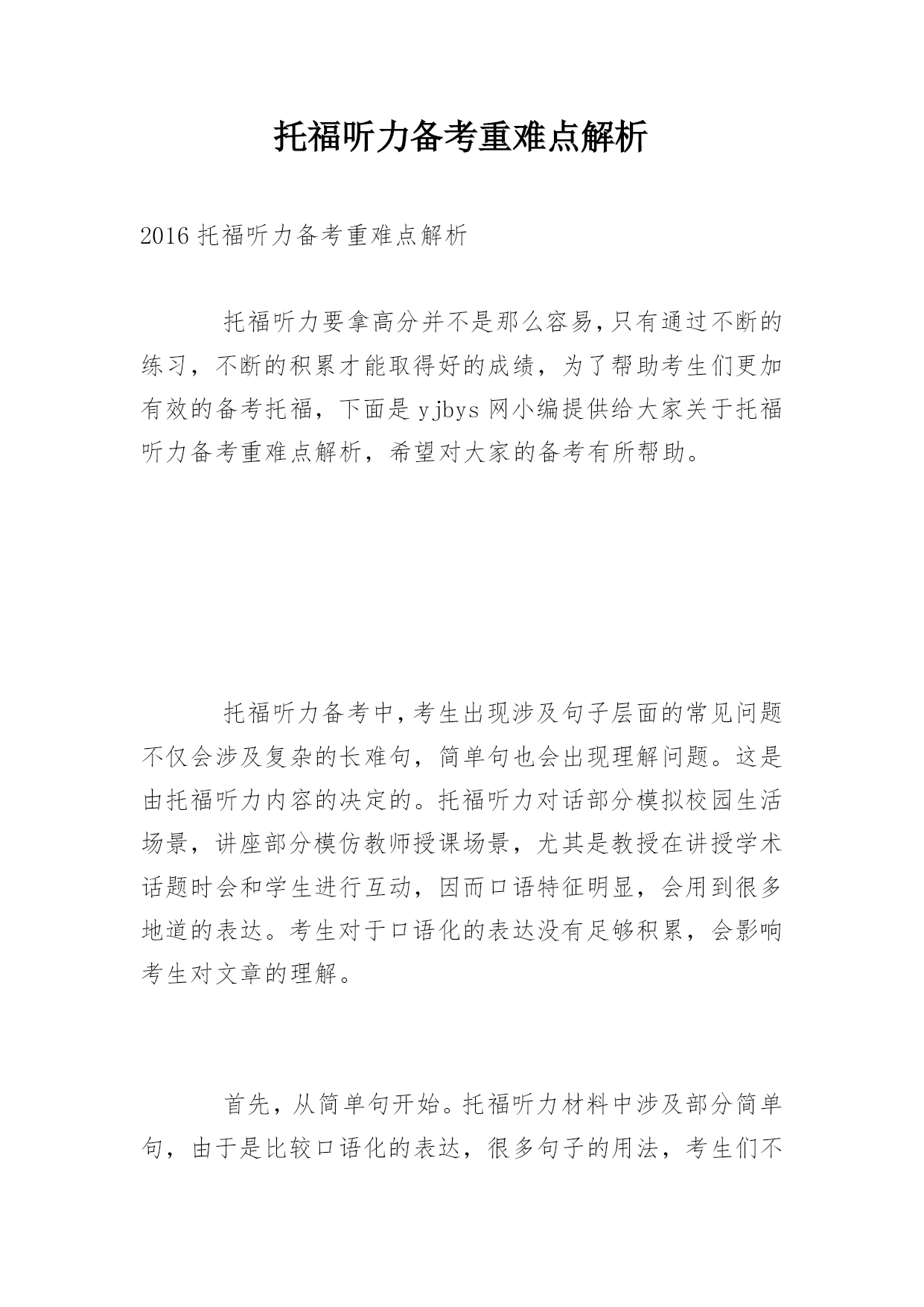 托福听力备考重难点解析2016托福听力备考重难点解析托福听力要拿高分并不是那么容易,只有通过不断的练习,不断的积累才能取得好的成绩,为了帮助考生们更加有效的备考托福,下面是yjbys网小编提供给大家关于托福听力备考重难点解析,希望对大家的备考有所帮助。托福听力备考中,考生出现涉及句子层面的常见问题不仅会涉及复杂的长难句,简单句也会出现理解问题。这是由托福听力内容的决定的。托福听力对话部分模拟校园生活场景,讲座部分模仿教师授课场景,尤其是教授在讲授学术话题时会和学生进行互动,因而口语特征明显,会用到很多地道