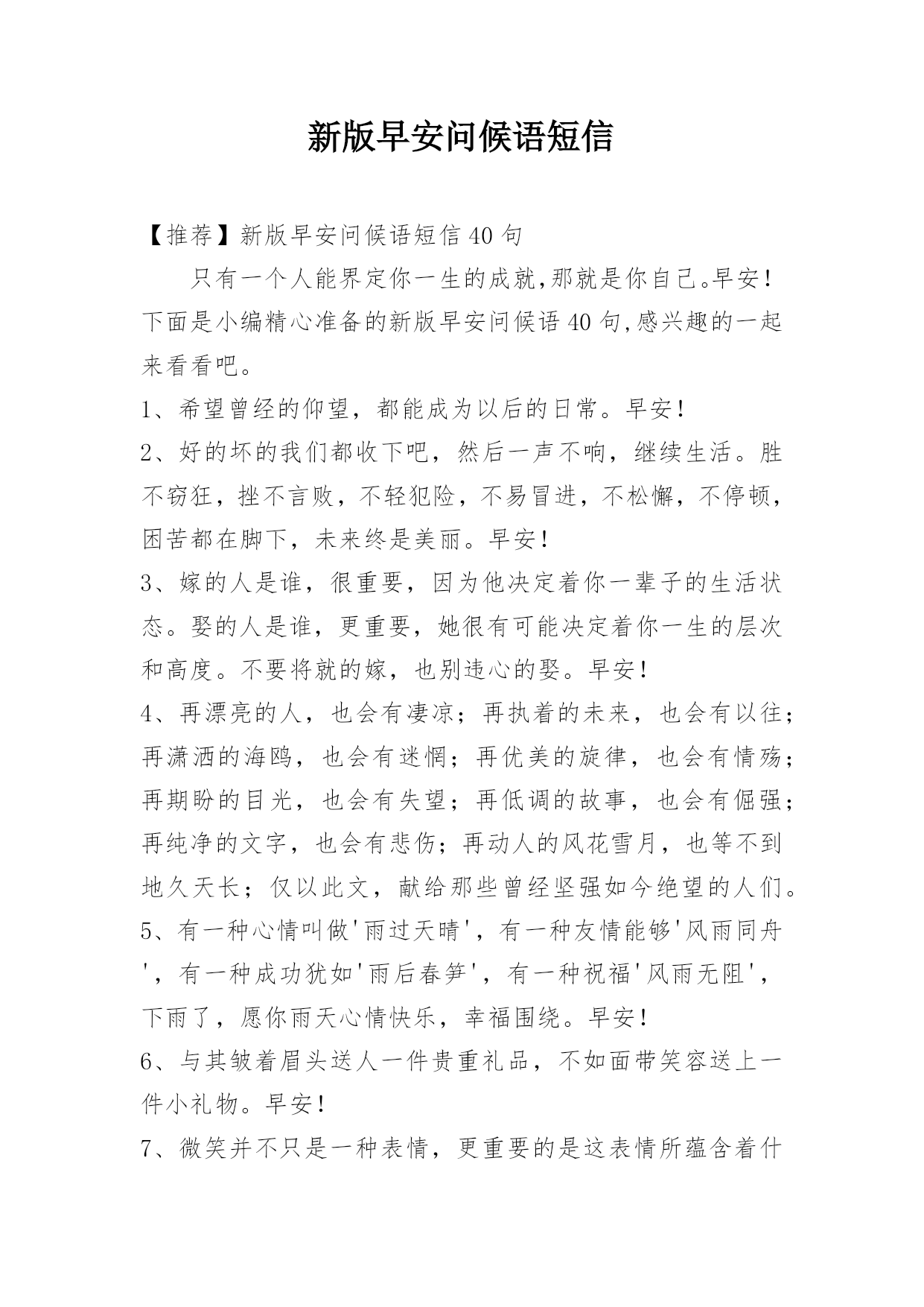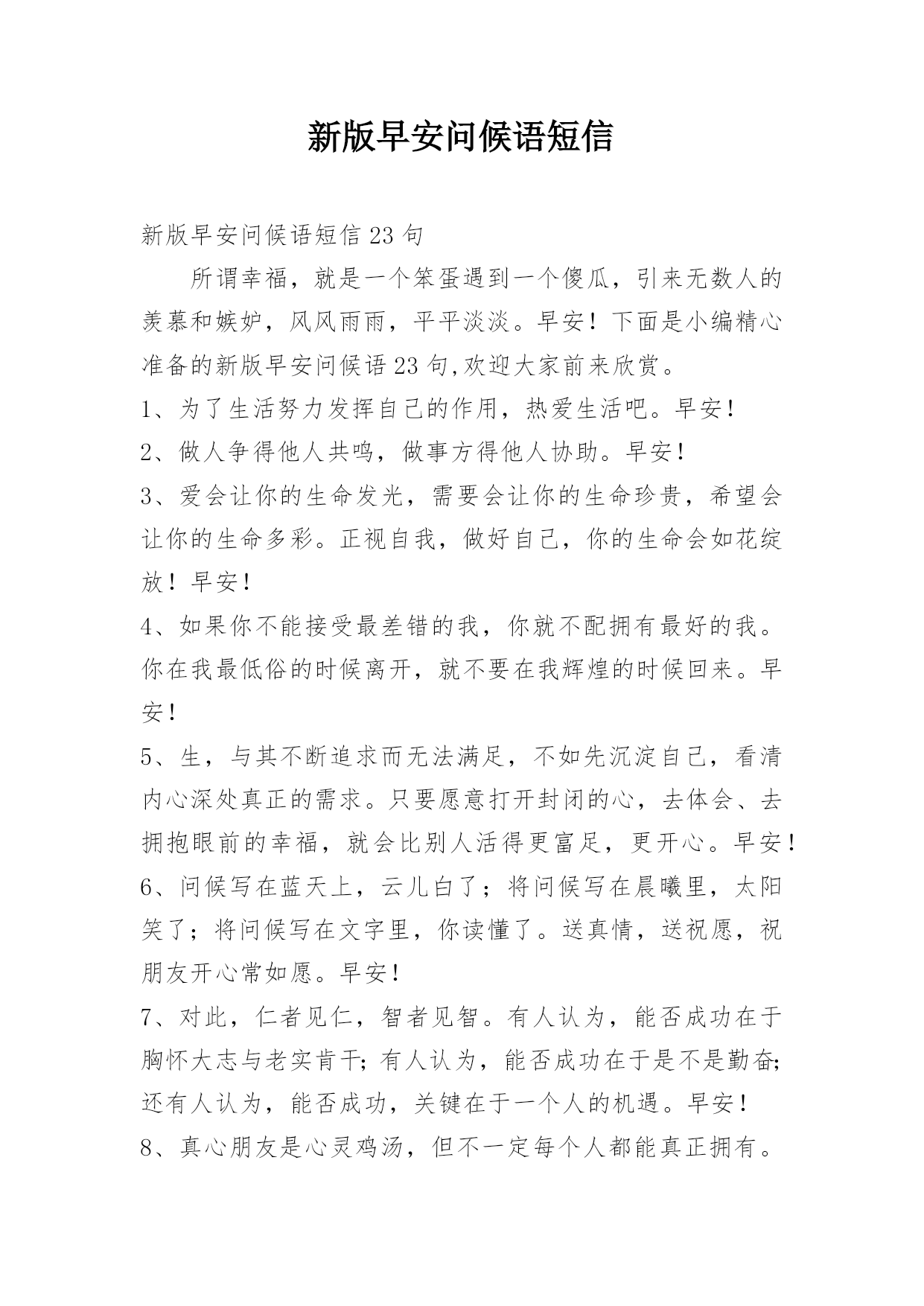 新版早安问候语短信新版早安问候语短信23句所谓幸福,就是一个笨蛋遇到一个傻瓜,引来无数人的羡慕和嫉妒,风风雨雨,平平淡淡。早安!下面是小编精心准备的新版早安问候语23句,欢迎大家前来欣赏。1、为了生活努力发挥自己的作用,热爱生活吧。早安!2、做人争得他人共鸣,做事方得他人协助。早安!3、爱会让你的生命发光,需要会让你的生命珍贵,希望会让你的生命多彩。正视自我,做好自己,你的生命会如花绽放!早安!4、如果你不能接受最差错的我,你就不配拥有最好的我。你在我最低俗的时候离开,就不要在我辉煌的时候回来。早安!5、