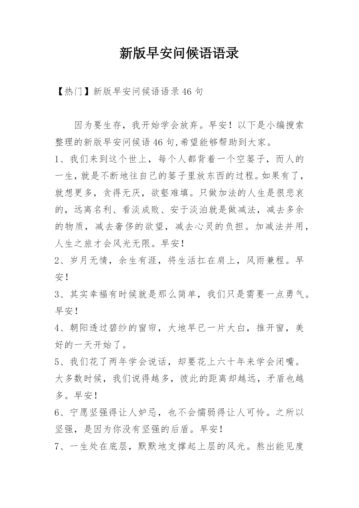 新版早安问候语语录【热门】新版早安问候语语录46句因为要生存,我开始学会放弃。早安!以下是小编搜索整理的新版早安问候语46句,希望能够帮助到大家。1、我们来到这个世上,每个人都背着一个空篓子,而人的一生,就是不断地往自己的篓子里放东西的过程。如果有了,就想更多,贪得无厌,欲壑难填。只做加法的人生是很悲哀的,远离名利、看淡成败、安于淡泊就是做减法,减去多余的物质,减去奢侈的欲望,减去心灵的负担。加减法并用,人生之旅才会风光无限。早安!2、岁月无情,余生有涯,将生活扛在肩上,风雨兼程。早安!3、其实幸福有时候
