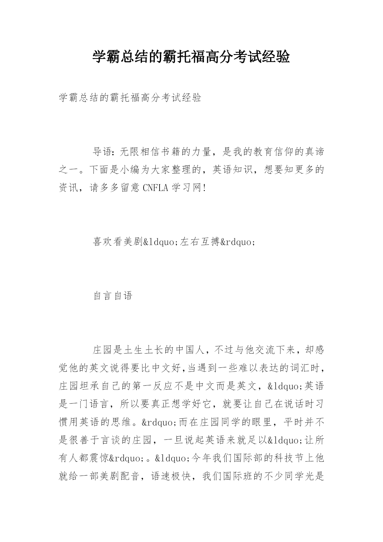 学霸总结的霸托福高分考试经验学霸总结的霸托福高分考试经验导语:无限相信书籍的力量,是我的教育信仰的真谛之一。下面是小编为大家整理的,英语知识,想要知更多的资讯,请多多留意CNFLA学习网!喜欢看美剧“左右互搏”自言自语庄园是土生土长的中国人,不过与他交流下来,却感觉他的英文说得要比中文好,当遇到一些难以表达的词汇时,庄园坦承自己的第一反应不是中文而是英文,“英语是一门语言,所以要真正想学好它,就要让自己在说话时习惯用英语的思维。”而在庄园同学的眼里,平时并不