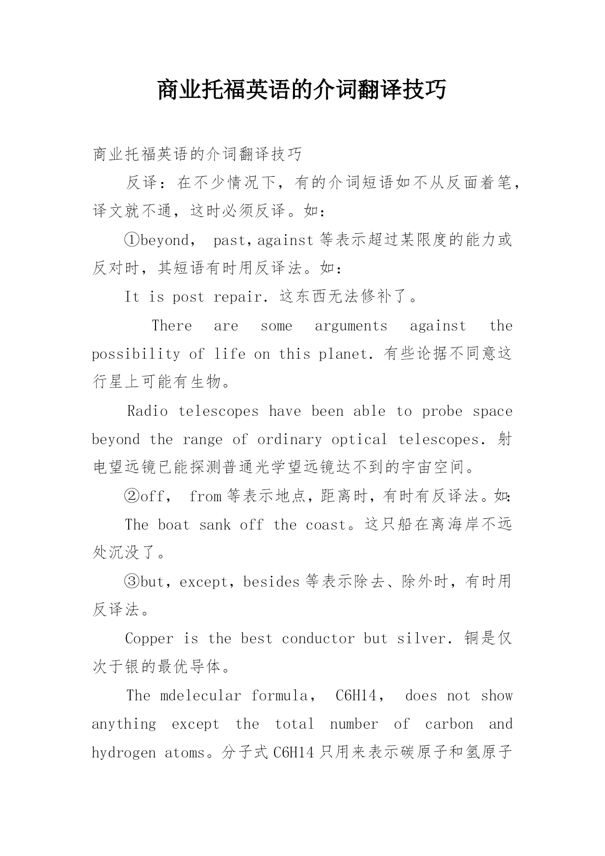 商业托福英语的介词翻译技巧商业托福英语的介词翻译技巧反译:在不少情况下,有的介词短语如不从反面着笔,译文就不通,这时必须反译。如:①beyond,past,against等表示超过某限度的能力或反对时,其短语有时用反译法。如:Itispostrepair.这东西无法修补了。Therearesomeargumentsagainstthepossibilityoflifeonthisplanet.有些论据不同意这行星上可能有生物。Radiotelescopeshavebeenabletoprobespaceb