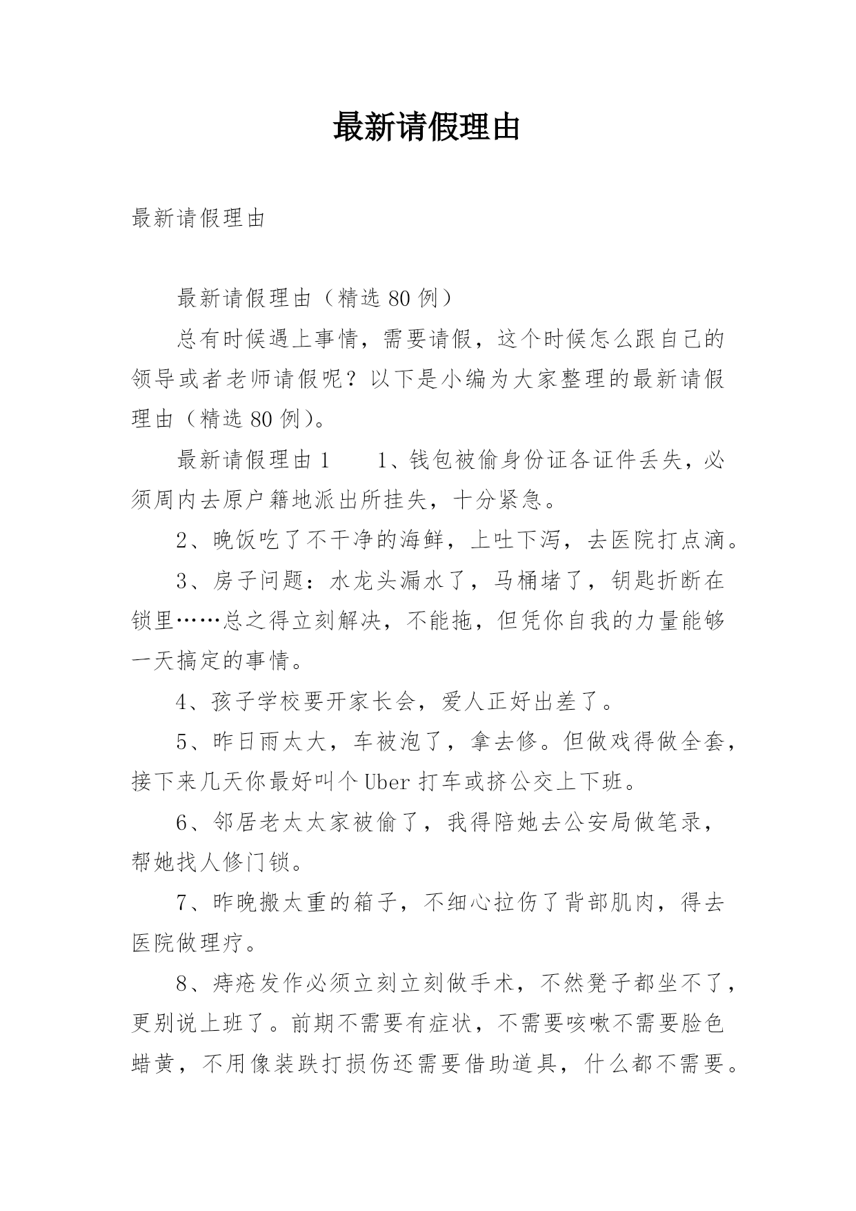 最新请假理由最新请假理由最新请假理由(精选80例)总有时候遇上事情,需要请假,这个时候怎么跟自己的领导或者老师请假呢?以下是小编为大家整理的最新请假理由(精选80例)。最新请假理由11、钱包被偷身份证各证件丢失,必须周内去原户籍地派出所挂失,十分紧急。2、晚饭吃了不干净的海鲜,上吐下泻,去医院打点滴。3、房子问题:水龙头漏水了,马桶堵了,钥匙折断在锁里……总之得立刻解决,不能拖,但凭你自我的力量能够一天搞定的事情。4、孩子学校要开家长会,爱人正好出差了。5、昨日雨太大,车被泡了,拿去修。但做戏得做全套,接