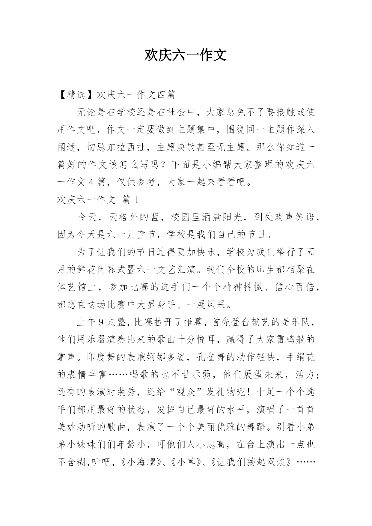 欢庆六一作文【精选】欢庆六一作文四篇无论是在学校还是在社会中,大家总免不了要接触或使用作文吧,作文一定要做到主题集中,围绕同一主题作深入阐述,切忌东拉西扯,主题涣散甚至无主题。那么你知道一篇好的作文该怎么写吗?下面是小编帮大家整理的欢庆六一作文4篇,仅供参考,大家一起来看看吧。欢庆六一作文篇1今天,天格外的蓝,校园里洒满阳光,到处欢声笑语,因为今天是六一儿童节,学校是我们自己的节日。为了让我们的节日过得更加快乐,学校为我们举行了五月的鲜花闭幕式暨六一文艺汇演。我们全校的师生都相聚在体艺馆上,参加比赛的选手