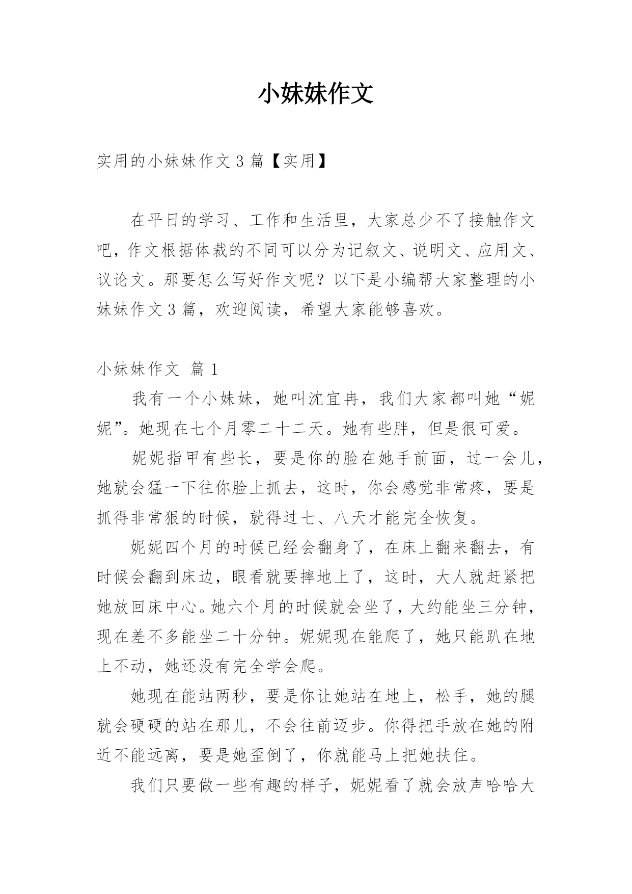小妹妹作文实用的小妹妹作文3篇【实用】在平日的学习、工作和生活里,大家总少不了接触作文吧,作文根据体裁的不同可以分为记叙文、说明文、应用文、议论文。那要怎么写好作文呢?以下是小编帮大家整理的小妹妹作文3篇,欢迎阅读,希望大家能够喜欢。小妹妹作文篇1我有一个小妹妹,她叫沈宜冉,我们大家都叫她“妮妮”。她现在七个月零二十二天。她有些胖,但是很可爱。妮妮指甲有些长,要是你的脸在她手前面,过一会儿,她就会猛一下往你脸上抓去,这时,你会感觉非常疼,要是抓得非常狠的时候,就得过七、八天才能完全恢复。妮妮四个月的时候已