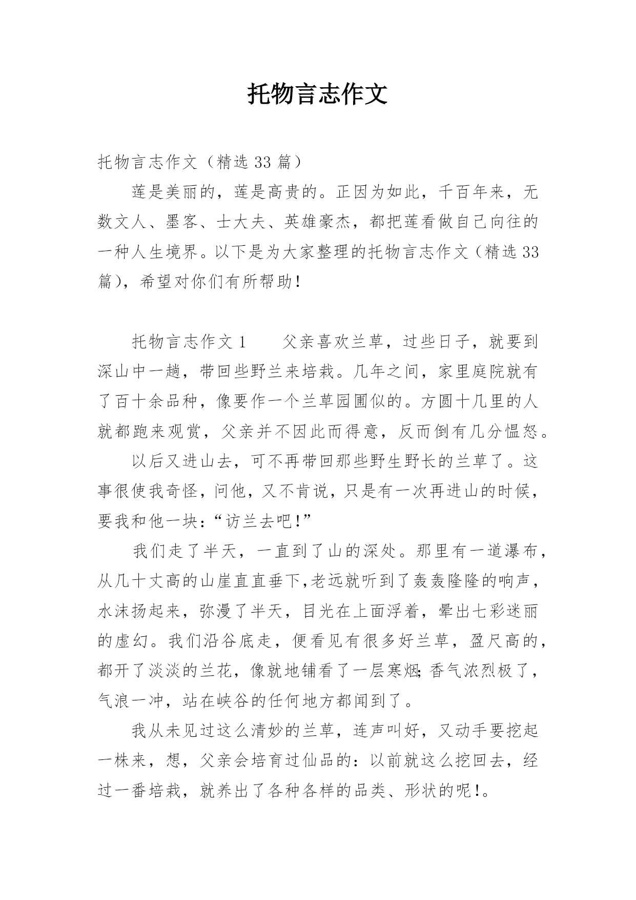 托物言志作文托物言志作文(精选33篇)莲是美丽的,莲是高贵的。正因为如此,千百年来,无数文人、墨客、士大夫、英雄豪杰,都把莲看做自己向往的一种人生境界。以下是为大家整理的托物言志作文(精选33篇),希望对你们有所帮助!托物言志作文1父亲喜欢兰草,过些日子,就要到深山中一趟,带回些野兰来培栽。几年之间,家里庭院就有了百十余品种,像要作一个兰草园圃似的。方圆十几里的人就都跑来观赏,父亲并不因此而得意,反而倒有几分愠怒。以后又进山去,可不再带回那些野生野长的兰草了。这事很使我奇怪,问他,又不肯说,只是有一次再进