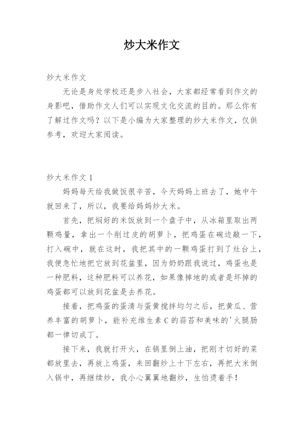 炒大米作文炒大米作文无论是身处学校还是步入社会,大家都经常看到作文的身影吧,借助作文人们可以实现文化交流的目的。那么你有了解过作文吗?以下是小编为大家整理的炒大米作文,仅供参考,欢迎大家阅读。炒大米作文1妈妈每天给我做饭很辛苦,今天妈妈上班去了,她中午就回来了,所以,我要给妈妈炒大米。首先,把焖好的米饭放到一个盘子中,从冰箱里取出两颗鸡量,拿出一个削过皮的胡萝卜,把鸡蛋在碗边敲一下,打入碗中,就在这时,我把其中的一颗鸡蛋打到了灶台上,我便急忙地把它放到花盆里,因为奶奶跟我说过,鸡蛋也是一种肥料,这种肥料可