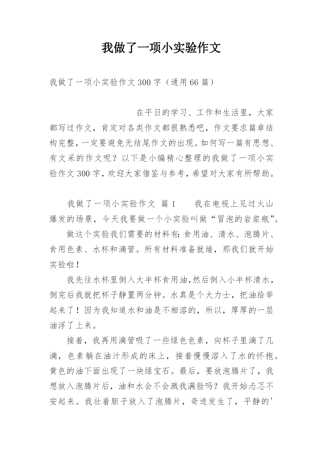 我做了一项小实验作文我做了一项小实验作文300字(通用66篇)在平日的学习、工作和生活里,大家都写过作文,肯定对各类作文都很熟悉吧,作文要求篇章结构完整,一定要避免无结尾作文的出现。如何写一篇有思想、有文采的作文呢?以下是小编精心整理的我做了一项小实验作文300字,欢迎大家借鉴与参考,希望对大家有所帮助。我做了一项小实验作文篇1我在电视上见过火山爆发的场景,今天我要做一个小实验叫做“冒泡的岩浆瓶”。做这个实验我们需要的材料有:食用油、清水、泡腾片、食用色素、水杯和滴管。所有材料准备就绪,那我们就开始实验啦