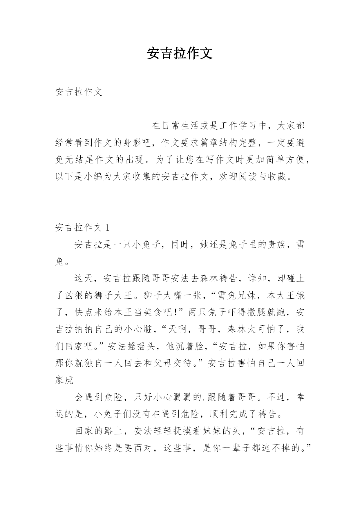 安吉拉作文安吉拉作文在日常生活或是工作学习中,大家都经常看到作文的身影吧,作文要求篇章结构完整,一定要避免无结尾作文的出现。为了让您在写作文时更加简单方便,以下是小编为大家收集的安吉拉作文,欢迎阅读与收藏。安吉拉作文1安吉拉是一只小兔子,同时,她还是兔子里的贵族,雪兔。这天,安吉拉跟随哥哥安法去森林祷告,谁知,却碰上了凶狠的狮子大王。狮子大嘴一张,“雪兔兄妹,本大王饿了,快点来给本王当美食吧!”两只兔子吓得撒腿就跑,安吉拉拍拍自己的小心脏,“天啊,哥哥,森林太可怕了,我们回家吧。”安法摇摇头,他沉着脸,“