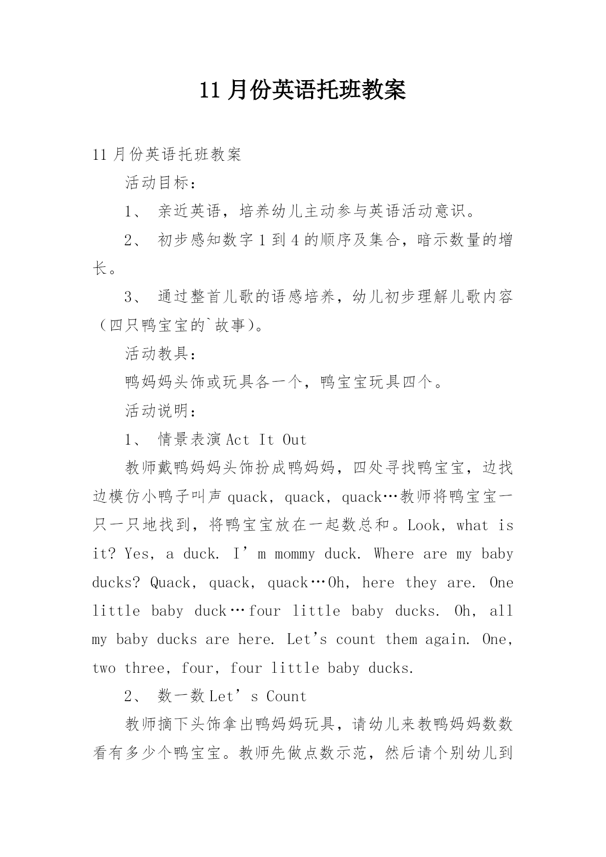 11月份英语托班教案11月份英语托班教案活动目标:1、亲近英语,培养幼儿主动参与英语活动意识。2、初步感知数字1到4的顺序及集合,暗示数量的增长。3、通过整首儿歌的语感培养,幼儿初步理解儿歌内容(四只鸭宝宝的`故事)。活动教具:鸭妈妈头饰或玩具各一个,鸭宝宝玩具四个。活动说明:1、情景表演ActItOut教师戴鸭妈妈头饰扮成鸭妈妈,四处寻找鸭宝宝,边找边模仿小鸭子叫声quack,quack,quack…教师将鸭宝宝一只一只地找到,将鸭宝宝放在一起数总和。Look,whatisit?Yes,aduck.I’