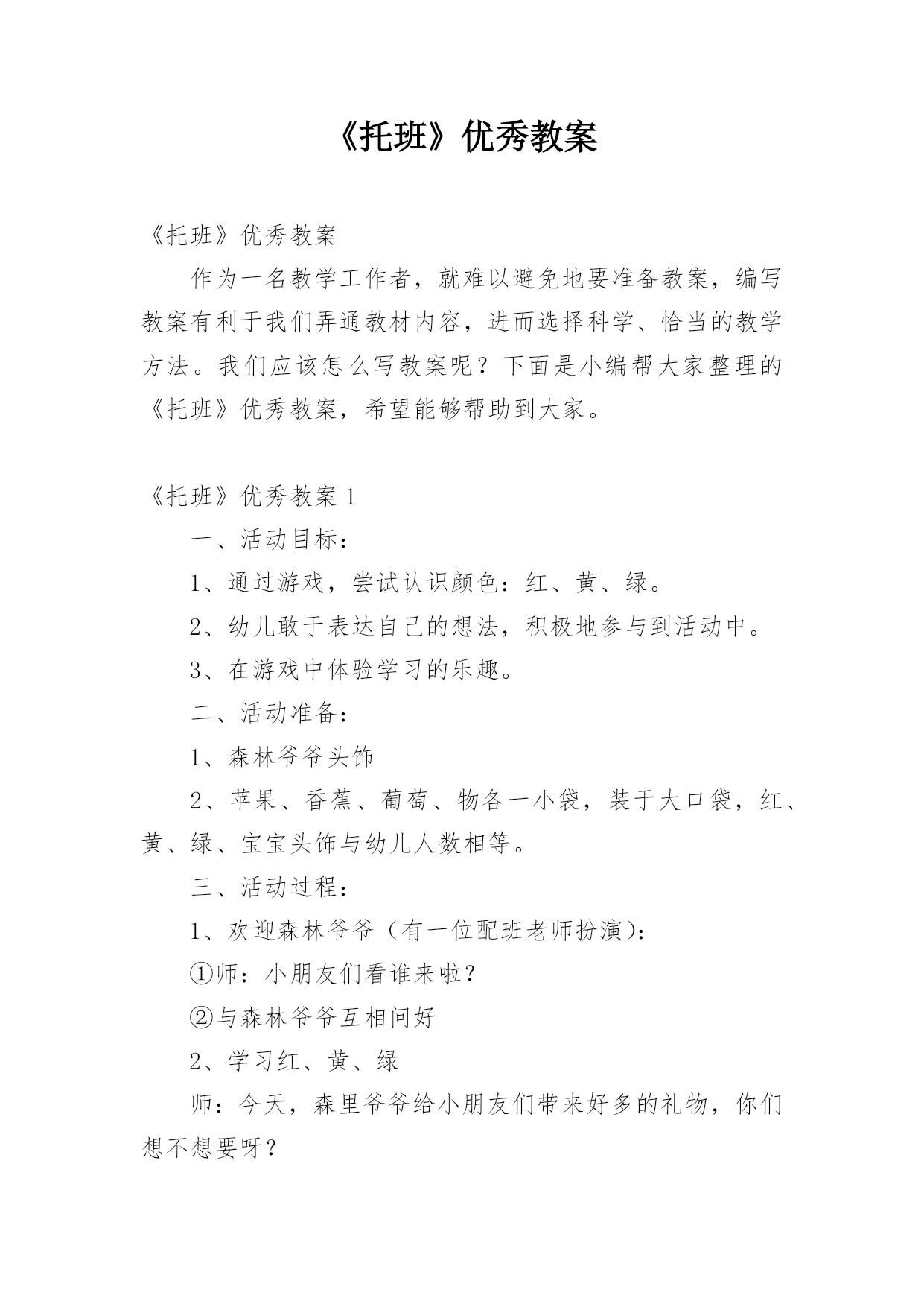 《托班》优秀教案《托班》优秀教案作为一名教学工作者,就难以避免地要准备教案,编写教案有利于我们弄通教材内容,进而选择科学、恰当的教学方法。我们应该怎么写教案呢?下面是小编帮大家整理的《托班》优秀教案,希望能够帮助到大家。《托班》优秀教案1一、活动目标:1、通过游戏,尝试认识颜色:红、黄、绿。2、幼儿敢于表达自己的想法,积极地参与到活动中。3、在游戏中体验学习的乐趣。二、活动准备:1、森林爷爷头饰2、苹果、香蕉、葡萄、物各一小袋,装于大口袋,红、黄、绿、宝宝头饰与幼儿人数相等。三、活动过程:1、欢迎森林爷爷
