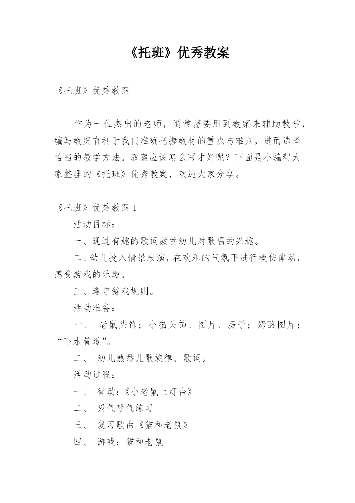《托班》优秀教案《托班》优秀教案作为一位杰出的老师,通常需要用到教案来辅助教学,编写教案有利于我们准确把握教材的重点与难点,进而选择恰当的教学方法。教案应该怎么写才好呢?下面是小编帮大家整理的《托班》优秀教案,欢迎大家分享。《托班》优秀教案1活动目标:一、通过有趣的歌词激发幼儿对歌唱的兴趣。二、幼儿投入情景表演,在欢乐的气氛下进行模仿律动,感受游戏的乐趣。三、遵守游戏规则。活动准备:一、老鼠头饰;小猫头饰、图片、房子;奶酪图片;“下水管道”。二、幼儿熟悉儿歌旋律、歌词。活动过程:一、律动:《小老鼠上灯台》