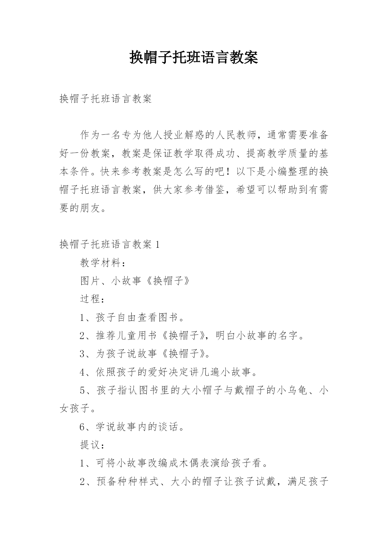 换帽子托班语言教案换帽子托班语言教案作为一名专为他人授业解惑的人民教师,通常需要准备好一份教案,教案是保证教学取得成功、提高教学质量的基本条件。快来参考教案是怎么写的吧!以下是小编整理的换帽子托班语言教案,供大家参考借鉴,希望可以帮助到有需要的朋友。换帽子托班语言教案1教学材料:图片、小故事《换帽子》过程:1、孩子自由查看图书。2、推荐儿童用书《换帽子》,明白小故事的名字。3、为孩子说故事《换帽子》。4、依照孩子的爱好决定讲几遍小故事。5、孩子指认图书里的大小帽子与戴帽子的小乌龟、小女孩子。6、学说故事内