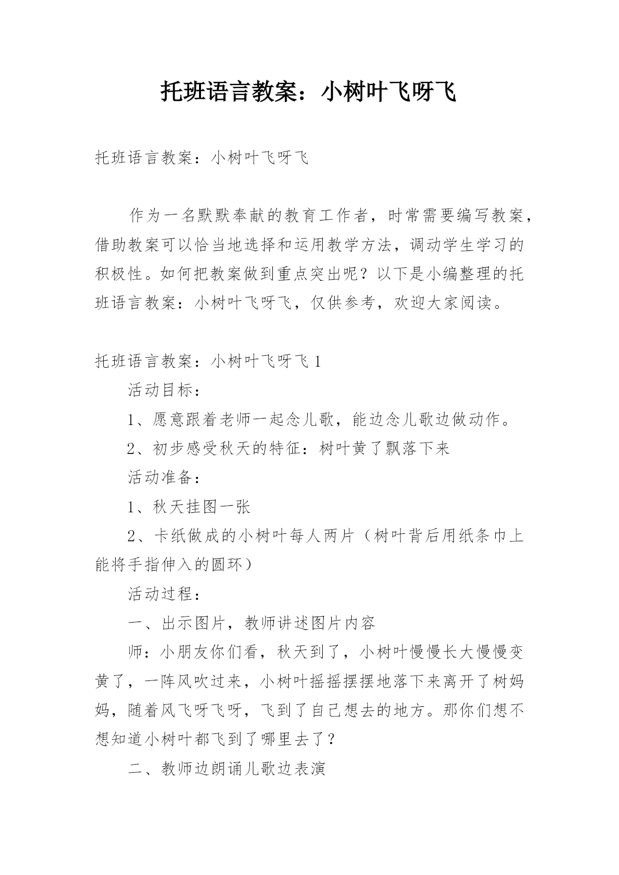 托班语言教案:小树叶飞呀飞托班语言教案:小树叶飞呀飞作为一名默默奉献的教育工作者,时常需要编写教案,借助教案可以恰当地选择和运用教学方法,调动学生学习的积极性。如何把教案做到重点突出呢?以下是小编整理的托班语言教案:小树叶飞呀飞,仅供参考,欢迎大家阅读。托班语言教案:小树叶飞呀飞1活动目标:1、愿意跟着老师一起念儿歌,能边念儿歌边做动作。2、初步感受秋天的特征:树叶黄了飘落下来活动准备:1、秋天挂图一张2、卡纸做成的小树叶每人两片(树叶背后用纸条巾上能将手指伸入的圆环)活动过程:一、出示图片,教师讲述图片