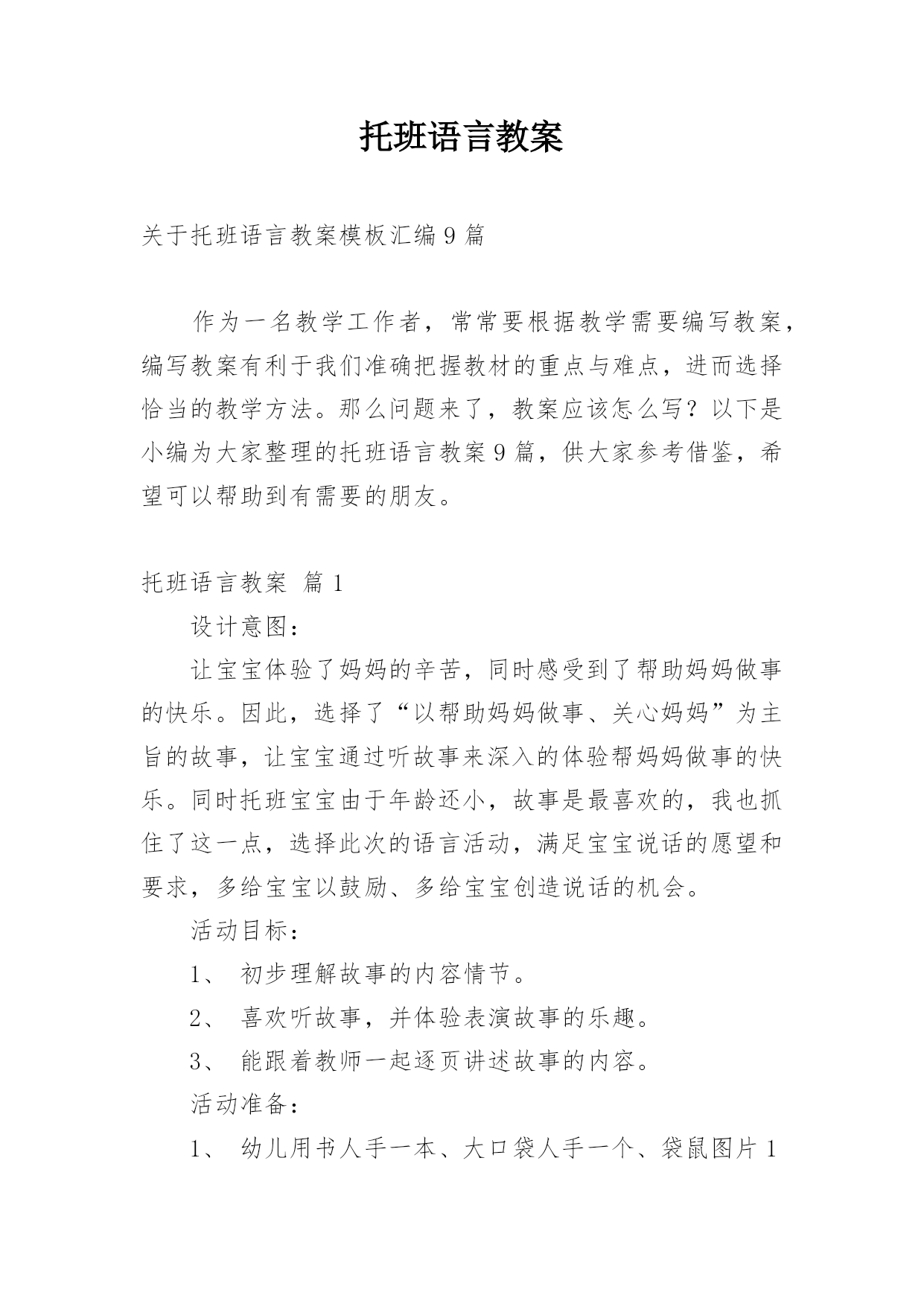 托班语言教案关于托班语言教案模板汇编9篇作为一名教学工作者,常常要根据教学需要编写教案,编写教案有利于我们准确把握教材的重点与难点,进而选择恰当的教学方法。那么问题来了,教案应该怎么写?以下是小编为大家整理的托班语言教案9篇,供大家参考借鉴,希望可以帮助到有需要的朋友。托班语言教案篇1设计意图:让宝宝体验了妈妈的辛苦,同时感受到了帮助妈妈做事的快乐。因此,选择了“以帮助妈妈做事、关心妈妈”为主旨的故事,让宝宝通过听故事来深入的体验帮妈妈做事的快乐。同时托班宝宝由于年龄还小,故事是最喜欢的,我也抓住了这一点