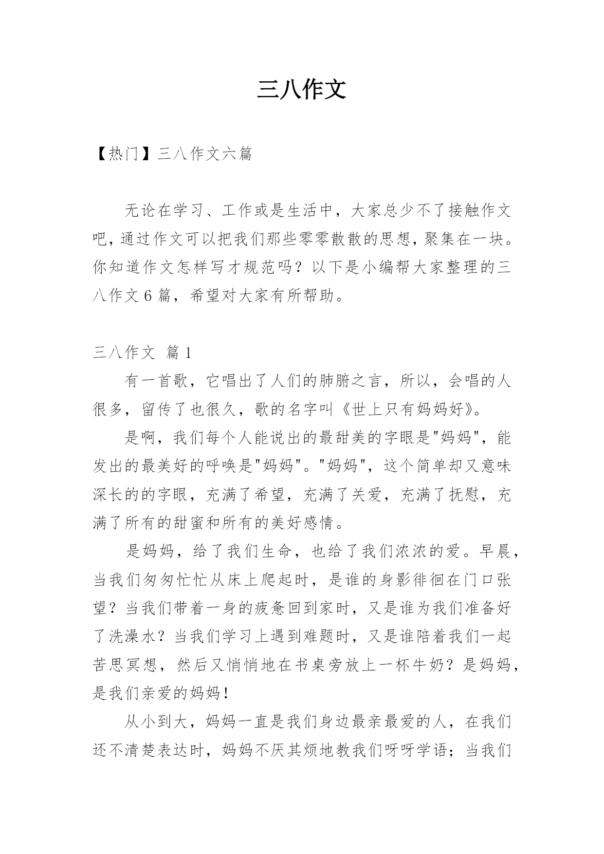 三八作文【热门】三八作文六篇无论在学习、工作或是生活中,大家总少不了接触作文吧,通过作文可以把我们那些零零散散的思想,聚集在一块。你知道作文怎样写才规范吗?以下是小编帮大家整理的三八作文6篇,希望对大家有所帮助。三八作文篇1有一首歌,它唱出了人们的肺腑之言,所以,会唱的人很多,留传了也很久,歌的名字叫《世上只有妈妈好》。是啊,我们每个人能说出的最甜美的字眼是"妈妈",能发出的最美好的呼唤是"妈妈"。"妈妈",这个简单却又意味深长的的字眼,充满了希望,充满了关爱,充满了抚慰,充满了所有的甜蜜和所有的美好感情