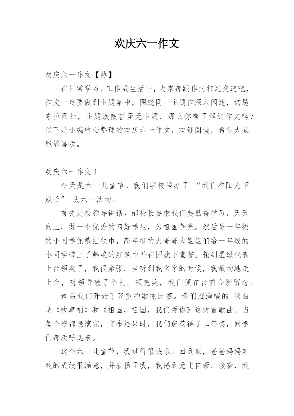 欢庆六一作文欢庆六一作文【热】在日常学习、工作或生活中,大家都跟作文打过交道吧,作文一定要做到主题集中,围绕同一主题作深入阐述,切忌东拉西扯,主题涣散甚至无主题。那么你有了解过作文吗?以下是小编精心整理的欢庆六一作文,欢迎阅读,希望大家能够喜欢。欢庆六一作文1今天是六一儿童节。我们学校举办了“我们在阳光下成长”庆六一活动。首先是校领导讲话。郝校长要求我们要勤奋学习,天天向上,做一个优秀的四好学生,为祖国争光。然后是一年级的小同学佩戴红领巾,高年级的大哥哥大姐姐们给一年级的小同学带上了鲜艳的红领巾并在国旗下