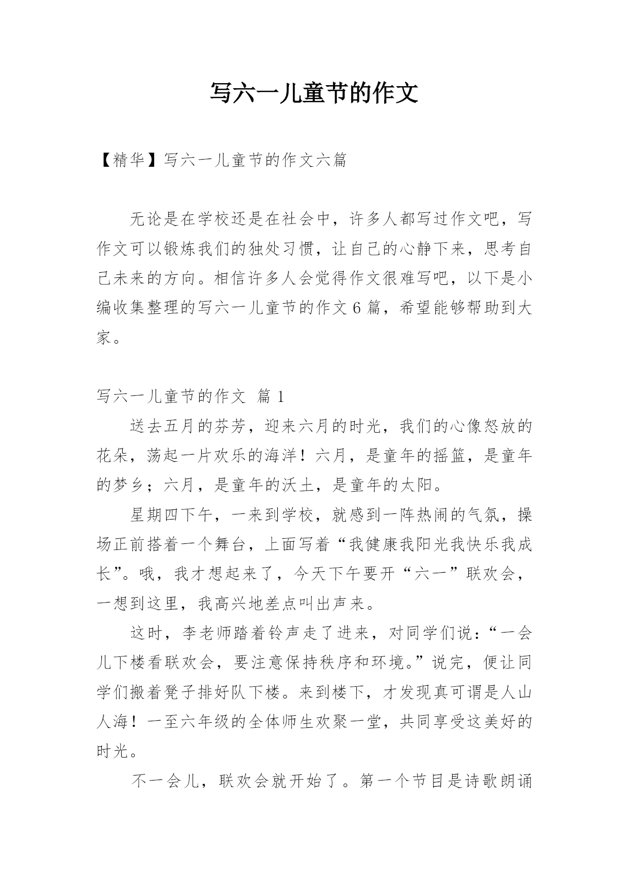 写六一儿童节的作文【精华】写六一儿童节的作文六篇无论是在学校还是在社会中,许多人都写过作文吧,写作文可以锻炼我们的独处习惯,让自己的心静下来,思考自己未来的方向。相信许多人会觉得作文很难写吧,以下是小编收集整理的写六一儿童节的作文6篇,希望能够帮助到大家。写六一儿童节的作文篇1送去五月的芬芳,迎来六月的时光,我们的心像怒放的花朵,荡起一片欢乐的海洋!六月,是童年的摇篮,是童年的梦乡;六月,是童年的沃土,是童年的太阳。星期四下午,一来到学校,就感到一阵热闹的气氛,操场正前搭着一个舞台,上面写着“我健康我阳光