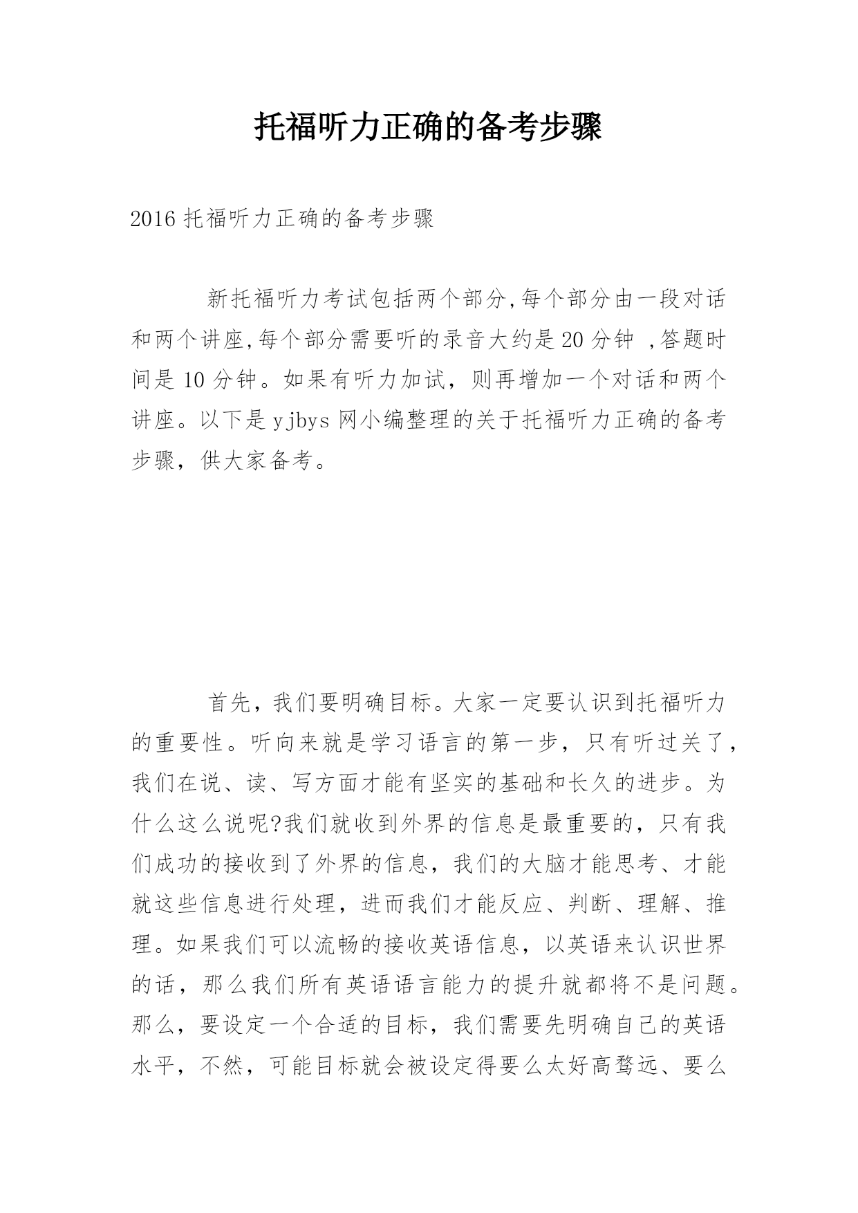 托福听力正确的备考步骤2016托福听力正确的备考步骤新托福听力考试包括两个部分,每个部分由一段对话和两个讲座,每个部分需要听的录音大约是20分钟,答题时间是10分钟。如果有听力加试,则再增加一个对话和两个讲座。以下是yjbys网小编整理的关于托福听力正确的备考步骤,供大家备考。首先,我们要明确目标。大家一定要认识到托福听力的重要性。听向来就是学习语言的第一步,只有听过关了,我们在说、读、写方面才能有坚实的基础和长久的进步。为什么这么说呢?我们就收到外界的信息是最重要的,只有我们成功的接收到了外界的信息,我