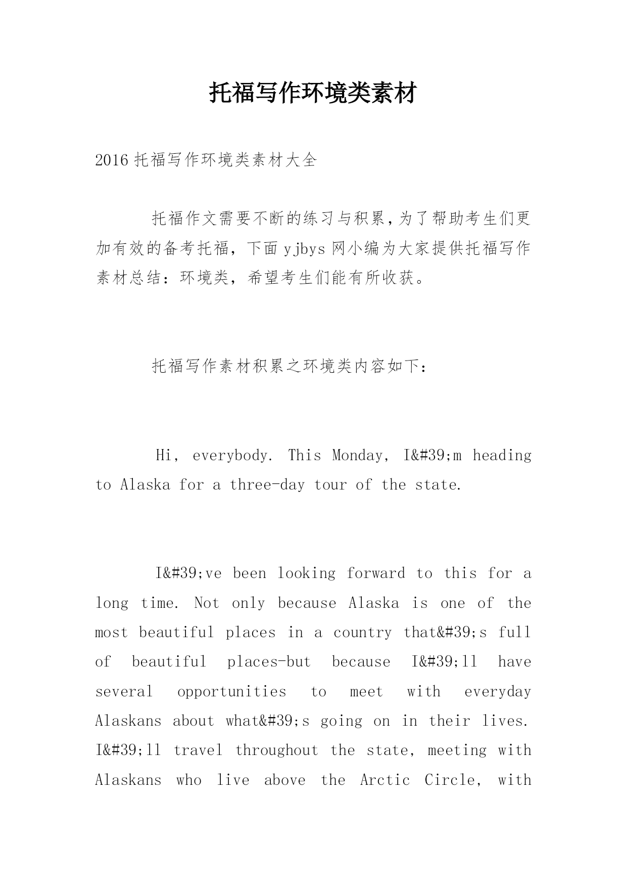 托福写作环境类素材2016托福写作环境类素材大全托福作文需要不断的练习与积累,为了帮助考生们更加有效的备考托福,下面yjbys网小编为大家提供托福写作素材总结:环境类,希望考生们能有所收获。托福写作素材积累之环境类内容如下:Hi,everybody.ThisMonday,I'mheadingtoAlaskaforathree-daytourofthestate.I'vebeenlookingforwardtothisforalongtime.NotonlybecauseAlaskaison
