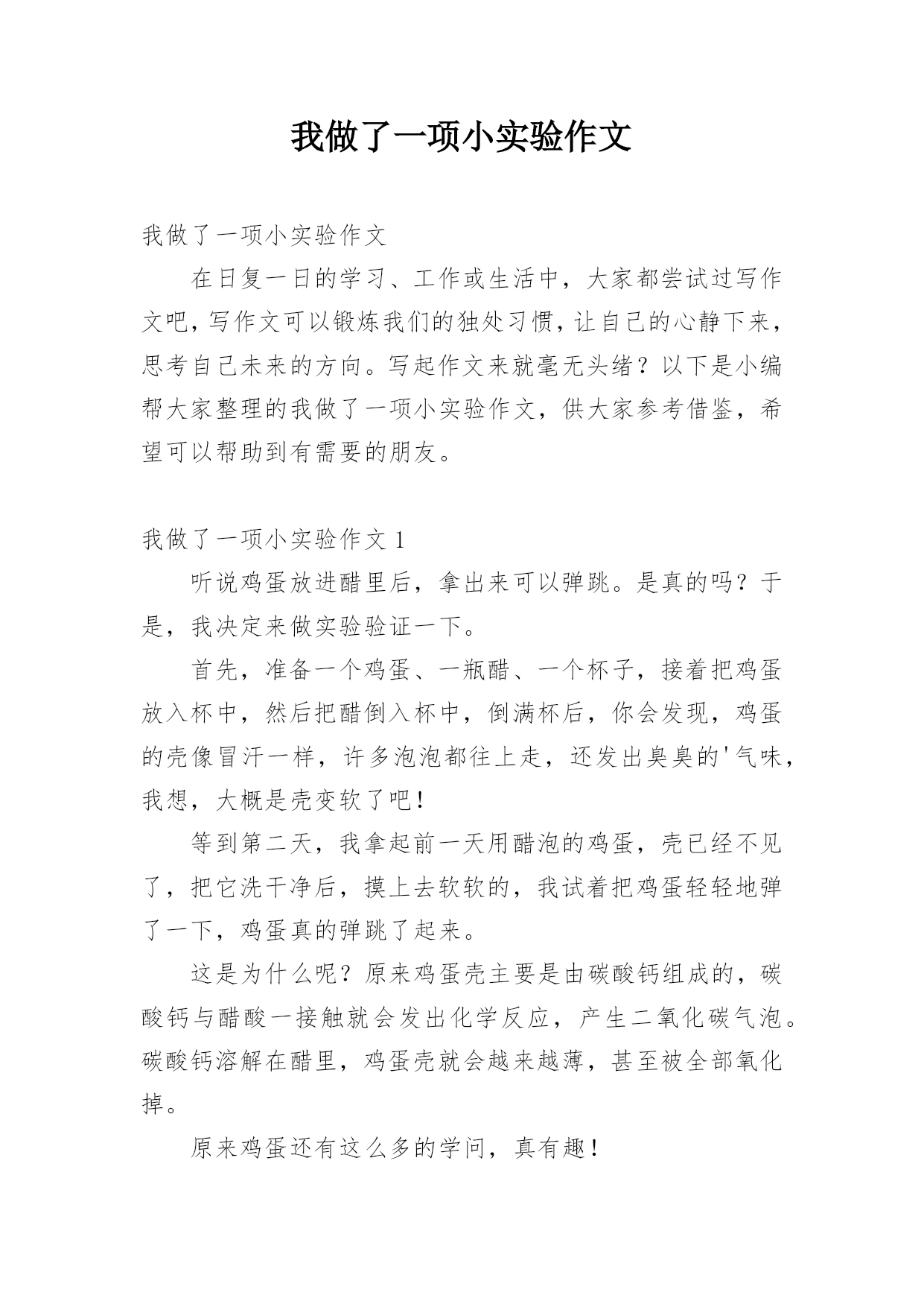 我做了一项小实验作文我做了一项小实验作文在日复一日的学习、工作或生活中,大家都尝试过写作文吧,写作文可以锻炼我们的独处习惯,让自己的心静下来,思考自己未来的方向。写起作文来就毫无头绪?以下是小编帮大家整理的我做了一项小实验作文,供大家参考借鉴,希望可以帮助到有需要的朋友。我做了一项小实验作文1听说鸡蛋放进醋里后,拿出来可以弹跳。是真的吗?于是,我决定来做实验验证一下。首先,准备一个鸡蛋、一瓶醋、一个杯子,接着把鸡蛋放入杯中,然后把醋倒入杯中,倒满杯后,你会发现,鸡蛋的壳像冒汗一样,许多泡泡都往上走,还发出