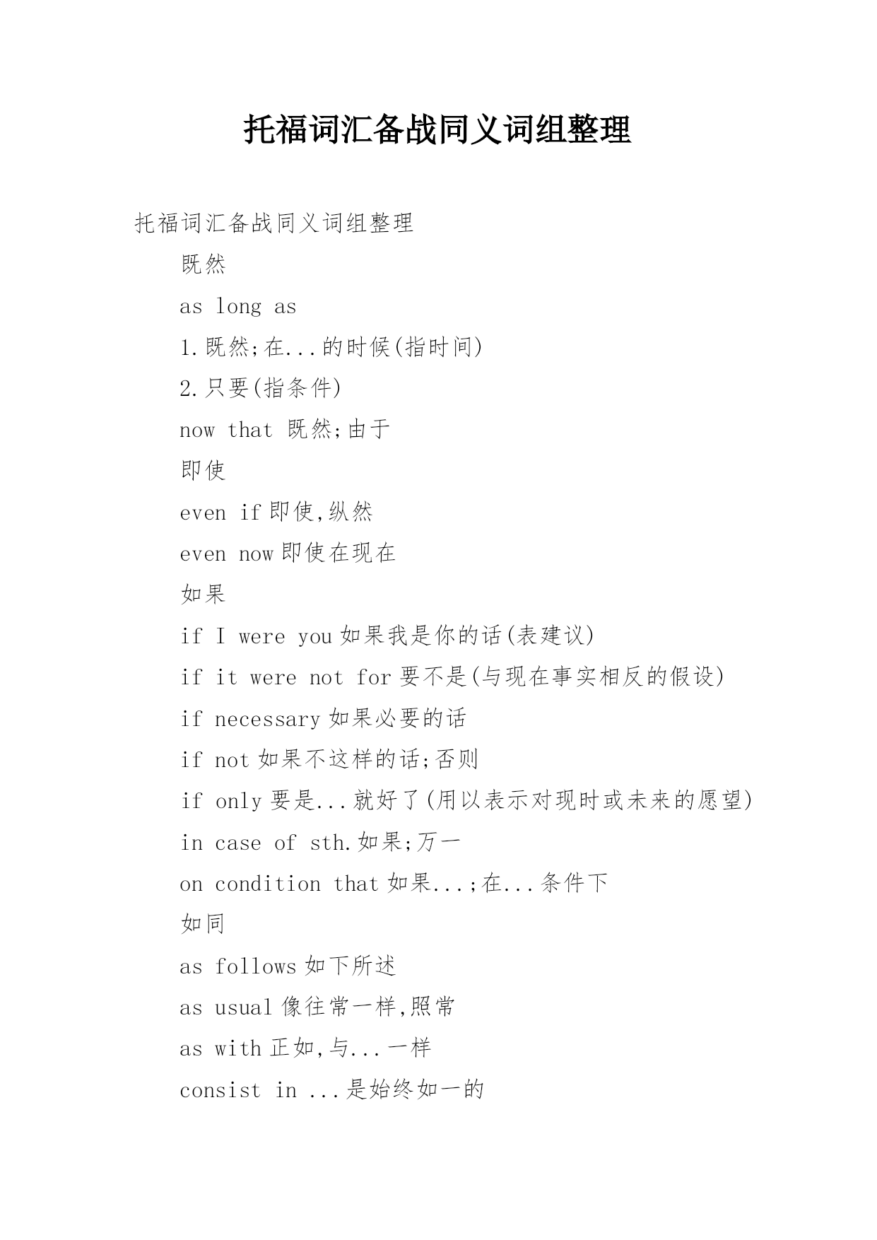 托福词汇备战同义词组整理托福词汇备战同义词组整理既然aslongas1.既然;在...的时候(指时间)2.只要(指条件)nowthat既然;由于即使evenif即使,纵然evennow即使在现在如果ifIwereyou如果我是你的话(表建议)ifitwerenotfor要不是(与现在事实相反的假设)ifnecessary如果必要的话ifnot如果不这样的话;否则ifonly要是...就好了(用以表示对现时或未来的愿望)incaseofsth.如果;万一onconditionthat如果...;在...条件