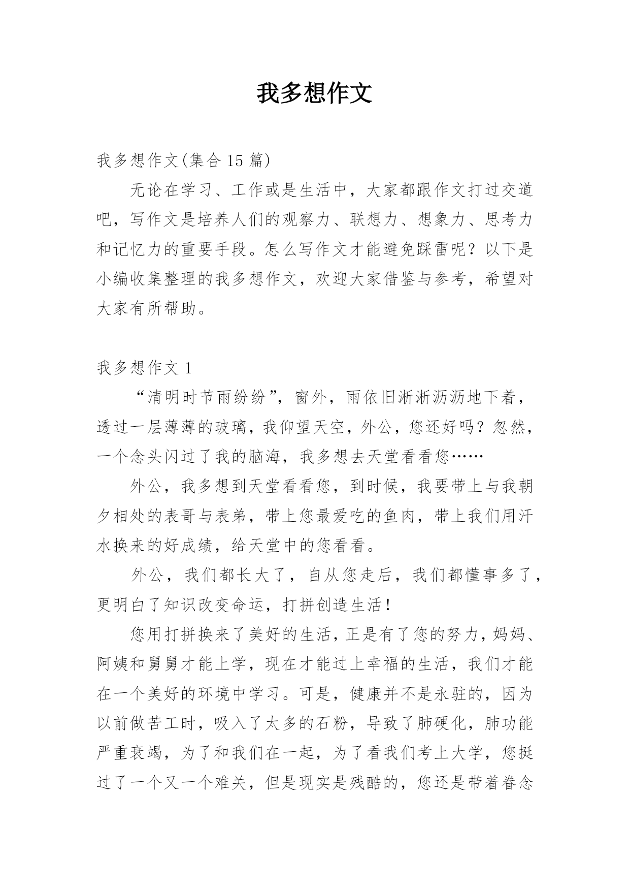我多想作文我多想作文(集合15篇)无论在学习、工作或是生活中,大家都跟作文打过交道吧,写作文是培养人们的观察力、联想力、想象力、思考力和记忆力的重要手段。怎么写作文才能避免踩雷呢?以下是小编收集整理的我多想作文,欢迎大家借鉴与参考,希望对大家有所帮助。我多想作文1“清明时节雨纷纷”,窗外,雨依旧淅淅沥沥地下着,透过一层薄薄的玻璃,我仰望天空,外公,您还好吗?忽然,一个念头闪过了我的脑海,我多想去天堂看看您……外公,我多想到天堂看看您,到时候,我要带上与我朝夕相处的表哥与表弟,带上您最爱吃的鱼肉,带上我们用
