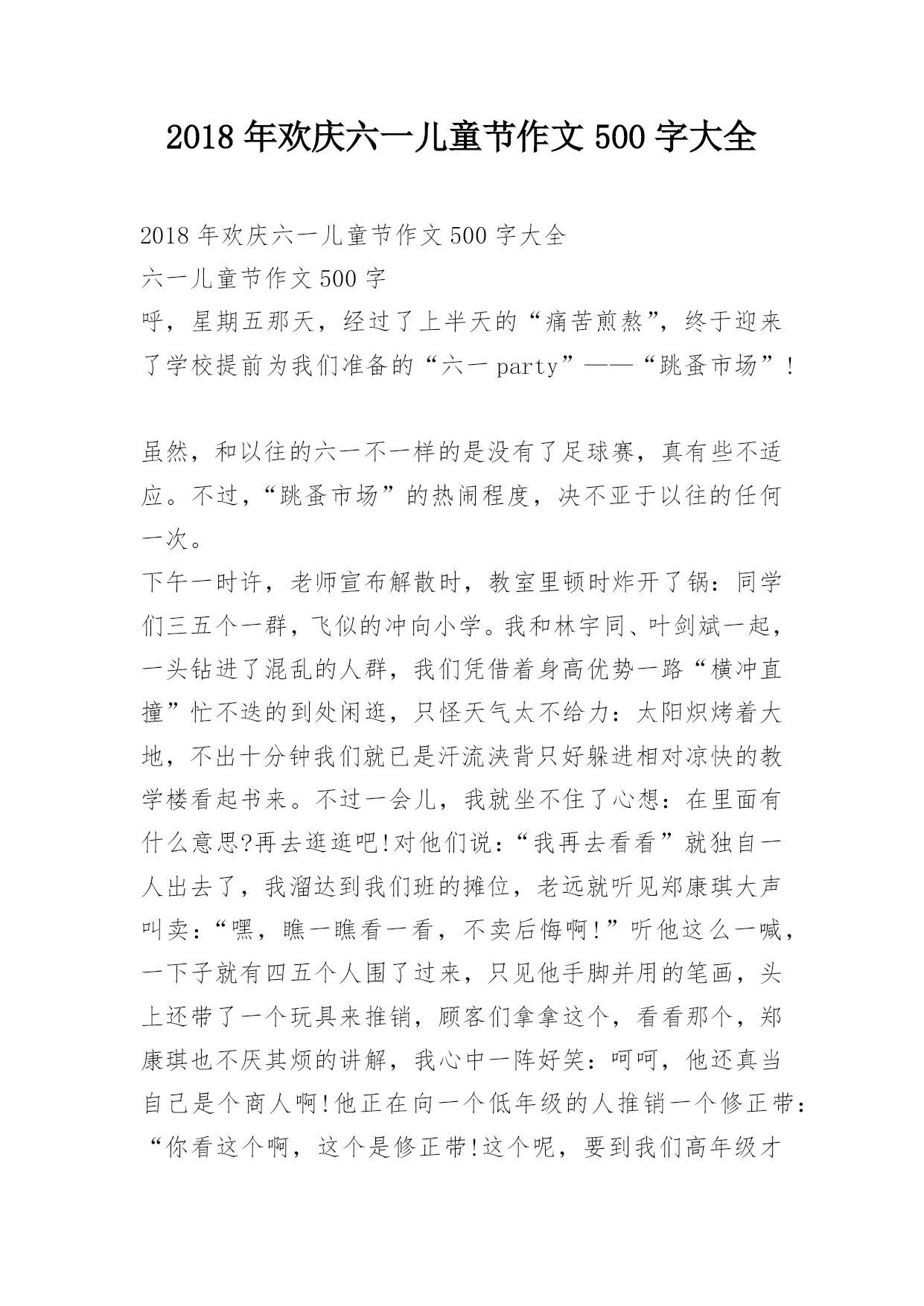 2018年欢庆六一儿童节作文500字大全2018年欢庆六一儿童节作文500字大全六一儿童节作文500字呼,星期五那天,经过了上半天的“痛苦煎熬”,终于迎来了学校提前为我们准备的“六一party”——“跳蚤市场”!虽然,和以往的六一不一样的是没有了足球赛,真有些不适应。不过,“跳蚤市场”的热闹程度,决不亚于以往的任何一次。下午一时许,老师宣布解散时,教室里顿时炸开了锅:同学们三五个一群,飞似的冲向小学。我和林宇同、叶剑斌一起,一头钻进了混乱的人群,我们凭借着身高优势一路“横冲直撞”忙不迭的到处闲逛,只怪天气