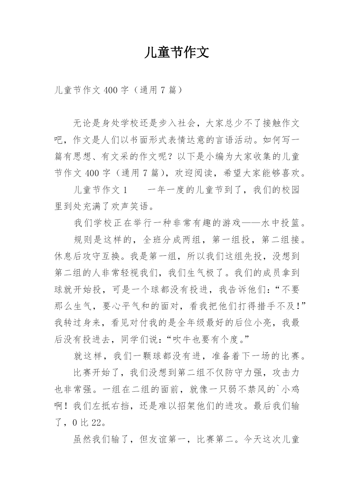 儿童节作文儿童节作文400字(通用7篇)无论是身处学校还是步入社会,大家总少不了接触作文吧,作文是人们以书面形式表情达意的言语活动。如何写一篇有思想、有文采的作文呢?以下是小编为大家收集的儿童节作文400字(通用7篇),欢迎阅读,希望大家能够喜欢。儿童节作文1一年一度的儿童节到了,我们的校园里到处充满了欢声笑语。我们学校正在举行一种非常有趣的游戏——水中投篮。规则是这样的,全班分成两组,第一组投,第二组接。休息后攻守互换。我是第一组,所以我们这组先投,没想到第二组的人非常轻视我们,我们生气极了。我们的成员