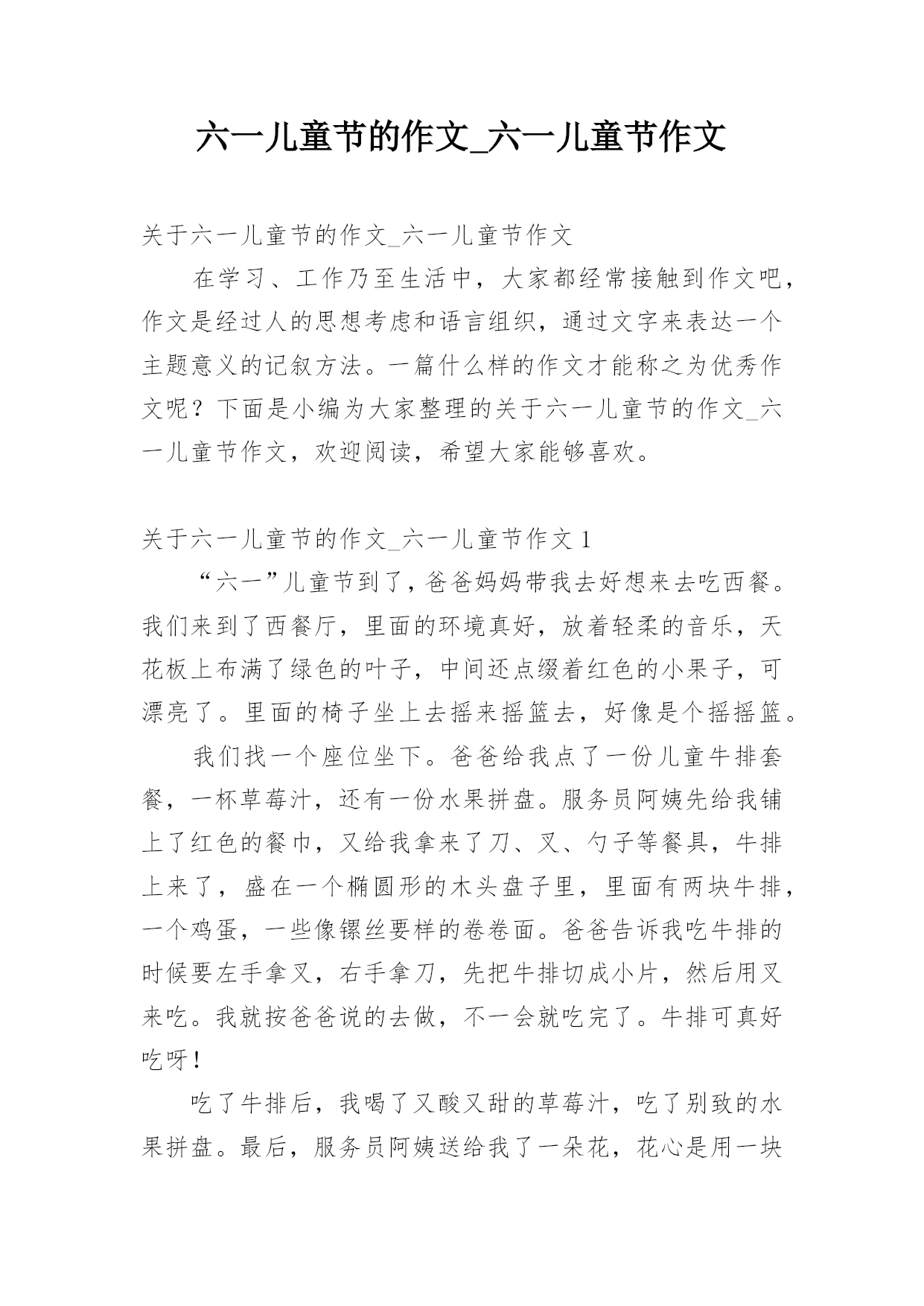 六一儿童节的作文_六一儿童节作文关于六一儿童节的作文_六一儿童节作文在学习、工作乃至生活中,大家都经常接触到作文吧,作文是经过人的思想考虑和语言组织,通过文字来表达一个主题意义的记叙方法。一篇什么样的作文才能称之为优秀作文呢?下面是小编为大家整理的关于六一儿童节的作文_六一儿童节作文,欢迎阅读,希望大家能够喜欢。关于六一儿童节的作文_六一儿童节作文1“六一”儿童节到了,爸爸妈妈带我去好想来去吃西餐。我们来到了西餐厅,里面的环境真好,放着轻柔的音乐,天花板上布满了绿色的叶子,中间还点缀着红色的小果子,可漂亮