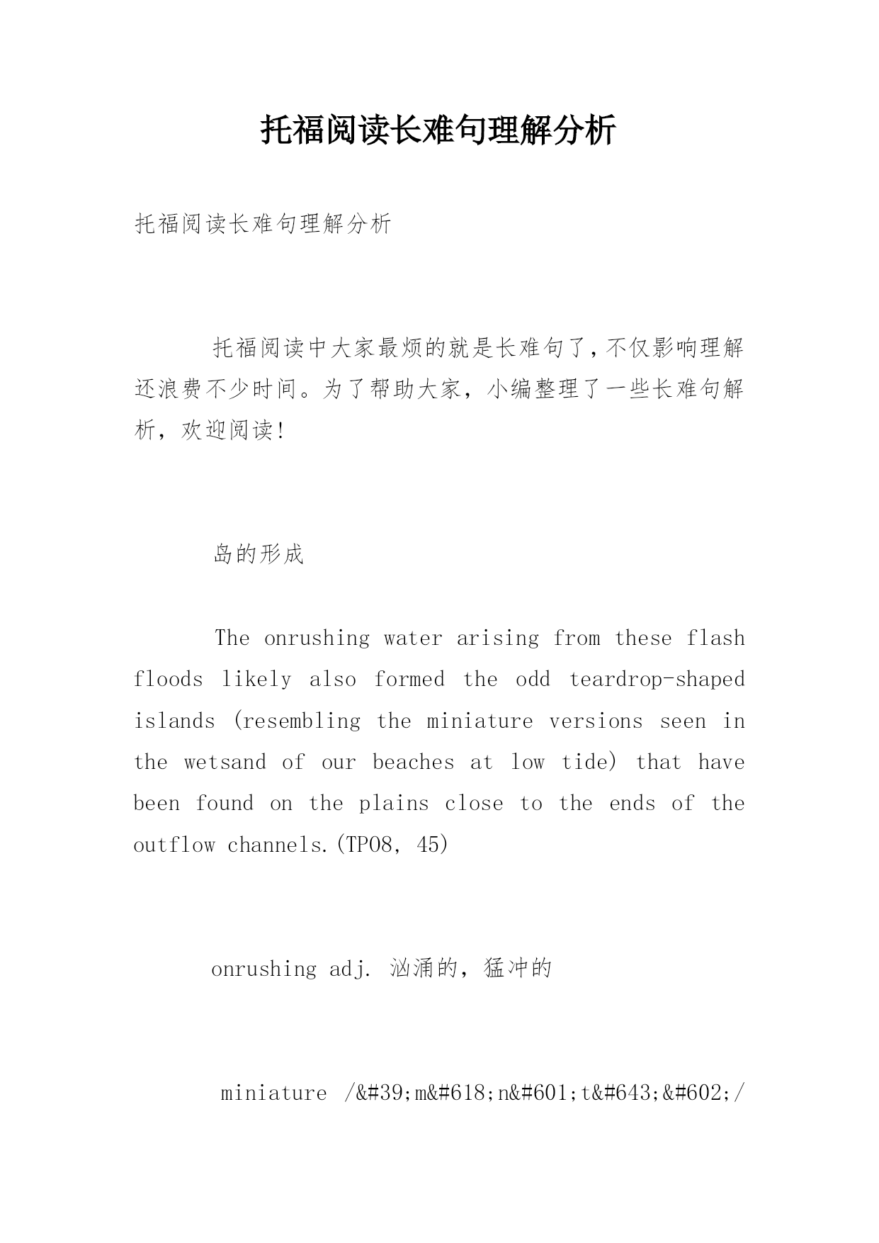 托福阅读长难句理解分析托福阅读长难句理解分析托福阅读中大家最烦的就是长难句了,不仅影响理解还浪费不少时间。为了帮助大家,小编整理了一些长难句解析,欢迎阅读!岛的形成Theonrushingwaterarisingfromtheseflashfloodslikelyalsoformedtheoddteardrop-shapedislands(resemblingtheminiatureversionsseeninthewetsandofourbeachesatlowtide)thathavebeenfoun