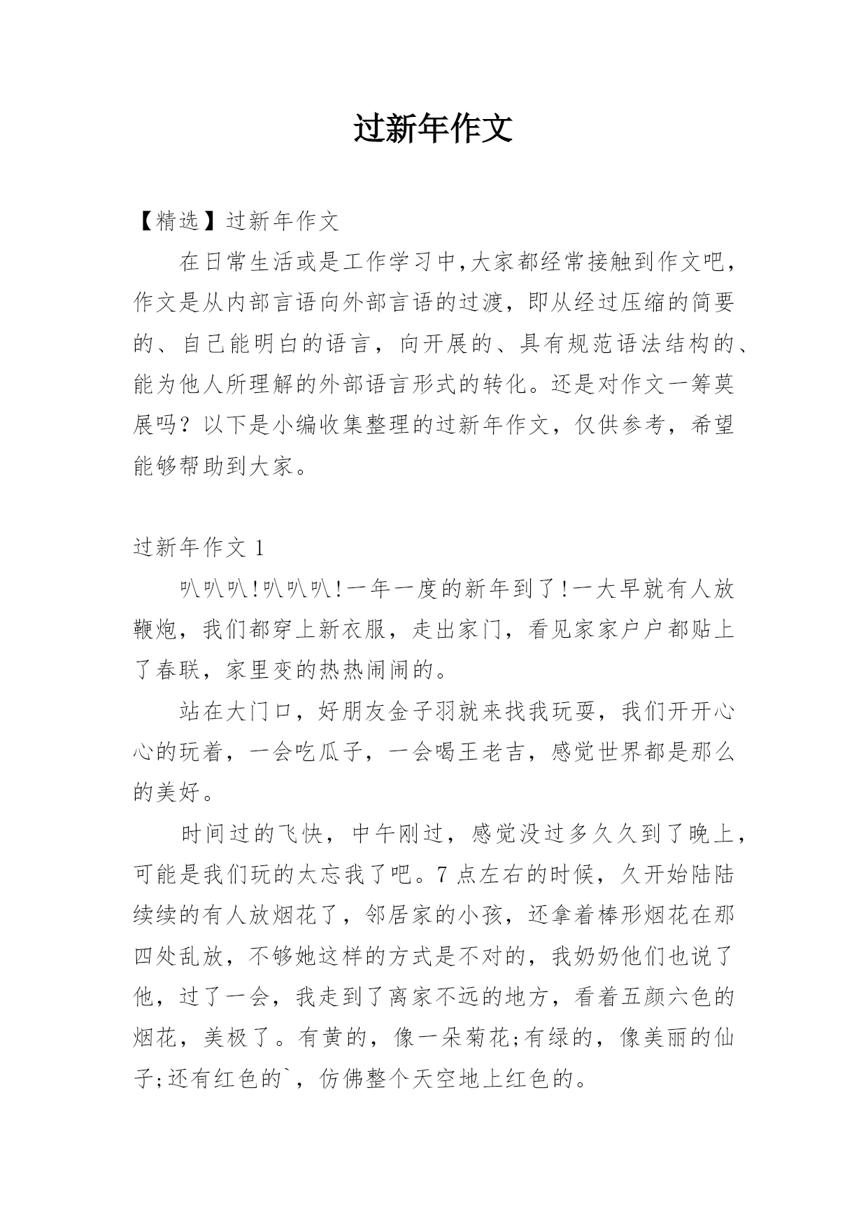 过新年作文【精选】过新年作文在日常生活或是工作学习中,大家都经常接触到作文吧,作文是从内部言语向外部言语的过渡,即从经过压缩的简要的、自己能明白的语言,向开展的、具有规范语法结构的、能为他人所理解的外部语言形式的转化。还是对作文一筹莫展吗?以下是小编收集整理的过新年作文,仅供参考,希望能够帮助到大家。过新年作文1叭叭叭!叭叭叭!一年一度的新年到了!一大早就有人放鞭炮,我们都穿上新衣服,走出家门,看见家家户户都贴上了春联,家里变的热热闹闹的。站在大门口,好朋友金子羽就来找我玩耍,我们开开心心的玩着,一会吃瓜