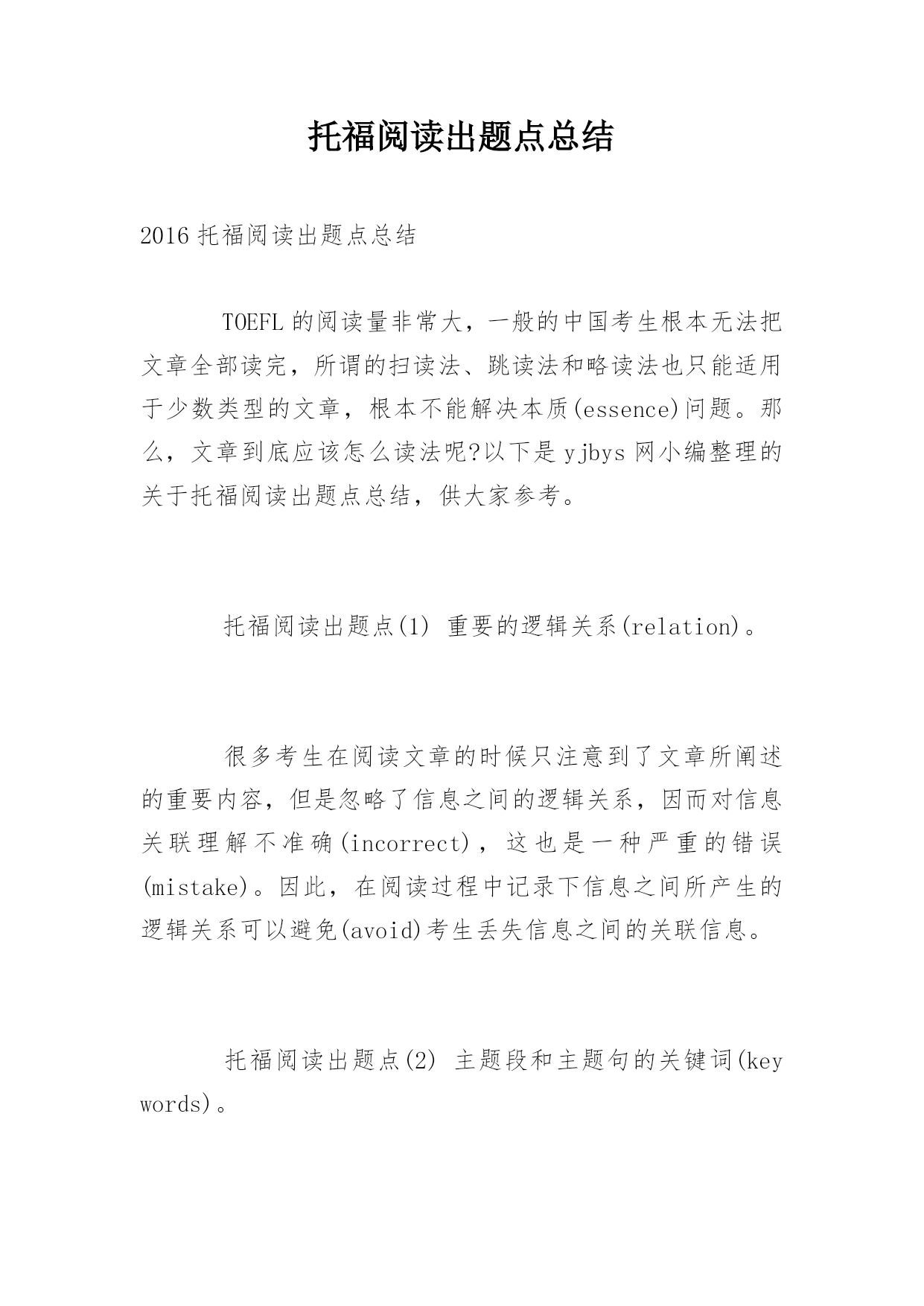 托福阅读出题点总结2016托福阅读出题点总结TOEFL的阅读量非常大,一般的中国考生根本无法把文章全部读完,所谓的扫读法、跳读法和略读法也只能适用于少数类型的文章,根本不能解决本质(essence)问题。那么,文章到底应该怎么读法呢?以下是yjbys网小编整理的关于托福阅读出题点总结,供大家参考。托福阅读出题点(1)重要的逻辑关系(relation)。很多考生在阅读文章的时候只注意到了文章所阐述的重要内容,但是忽略了信息之间的逻辑关系,因而对信息关联理解不准确(incorrect),这也是一种严重的错误(