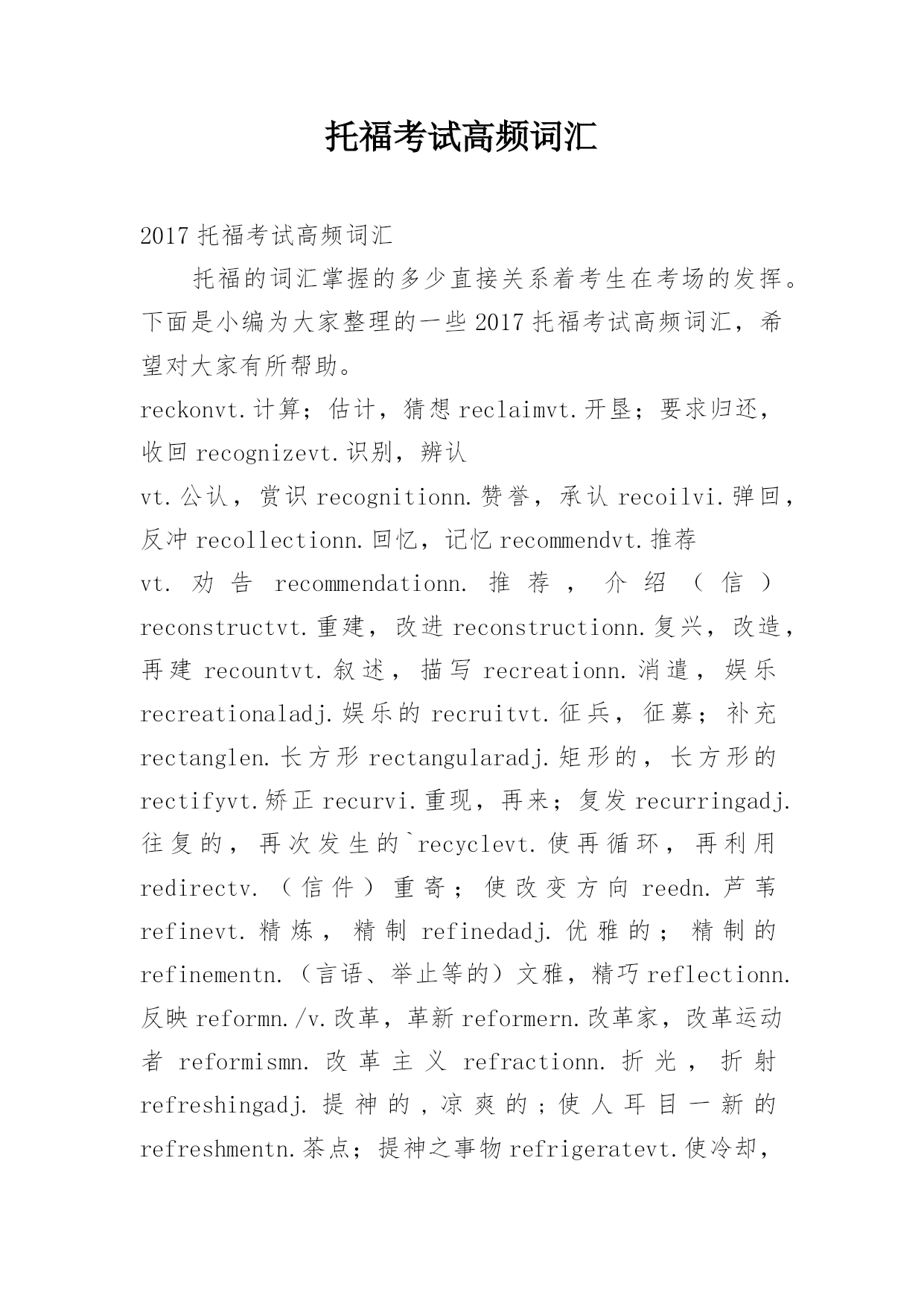托福考试高频词汇2017托福考试高频词汇托福的词汇掌握的多少直接关系着考生在考场的发挥。下面是小编为大家整理的一些2017托福考试高频词汇,希望对大家有所帮助。reckonvt.计算;估计,猜想reclaimvt.开垦;要求归还,收回recognizevt.识别,辨认vt.公认,赏识recognitionn.赞誉,承认recoilvi.弹回,反冲recollectionn.回忆,记忆recommendvt.推荐vt.劝告recommendationn.推荐,介绍(信)reconstructvt.重建,改进