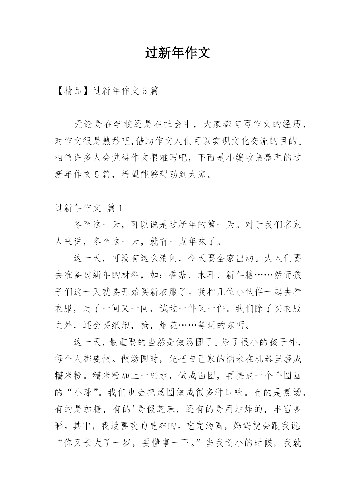 过新年作文【精品】过新年作文5篇无论是在学校还是在社会中,大家都有写作文的经历,对作文很是熟悉吧,借助作文人们可以实现文化交流的目的。相信许多人会觉得作文很难写吧,下面是小编收集整理的过新年作文5篇,希望能够帮助到大家。过新年作文篇1冬至这一天,可以说是过新年的第一天。对于我们客家人来说,冬至这一天,就有一点年味了。这一天,可没有这么清闲,今天要全家出动。大人们要去准备过新年的材料,如:香菇、木耳、新年糖……然而孩子们这一天就要开始买新衣服了。我和几位小伙伴一起去看衣服,走了一间又一间,试过一件又一件。我